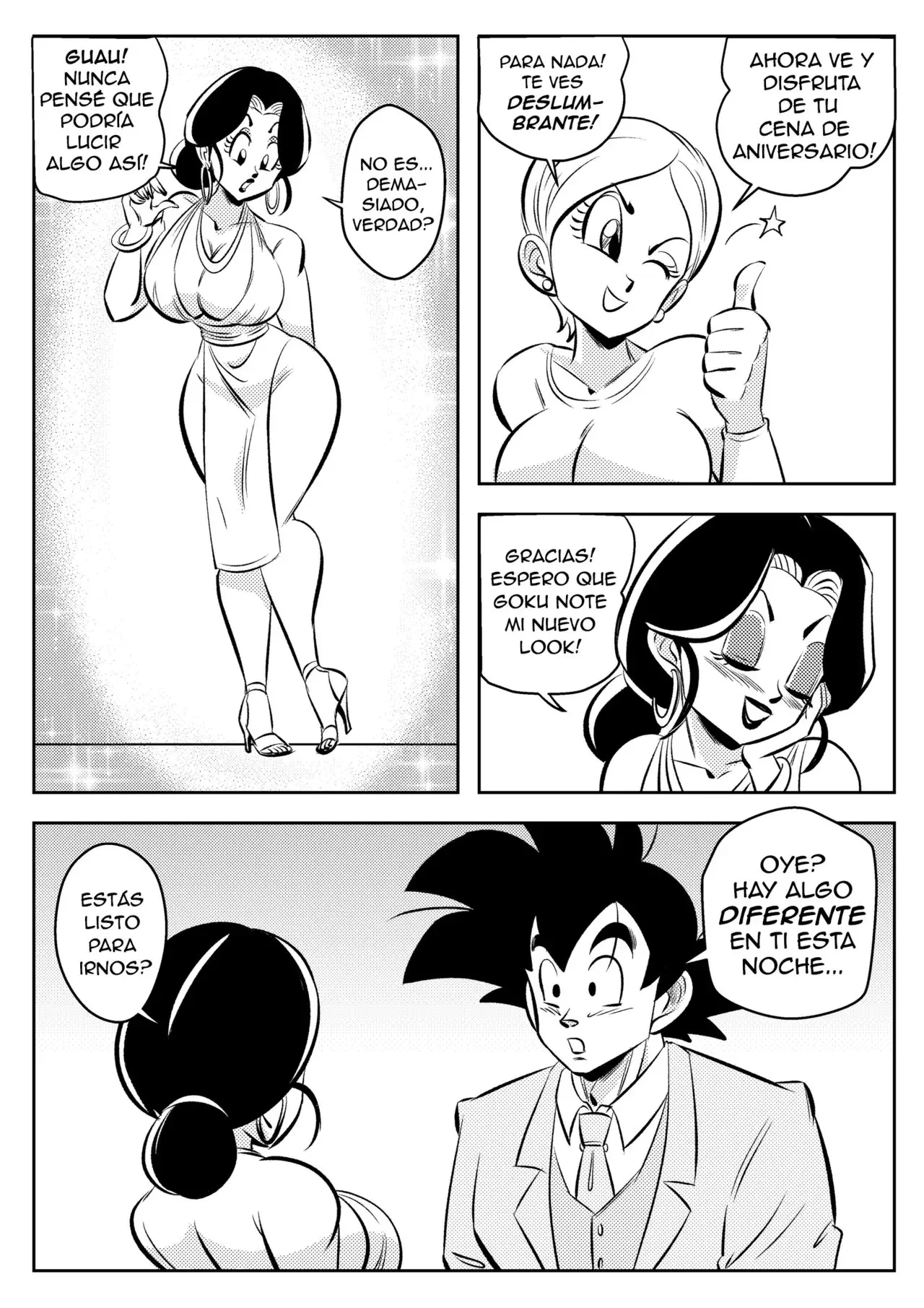 Bulma le da el toque final al maquillaje de Milk, lo cual la hace ver irresistible. Nunca pensó que podría verse así, por eso le parece un poco demasiado. Sin embargo, para Bulma, ella está deslumbrante y lista para ir a la cena de aniversario. Al final, Milk le dice a Goku que puede olvidarse de la cena luego de haber notado que está más alta. Ella tiene hambre de otra cosa y en el restaurante no lo servirán, comiéndole la polla y arruinando su maquillaje. Aunque parte de la culpa la tiene Goku, que le empuja su cabeza y le hace llorar con la garganta profunda. Ha sido el mejor aniversario para Milk.