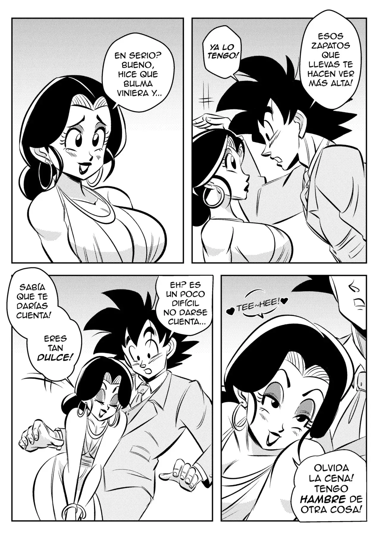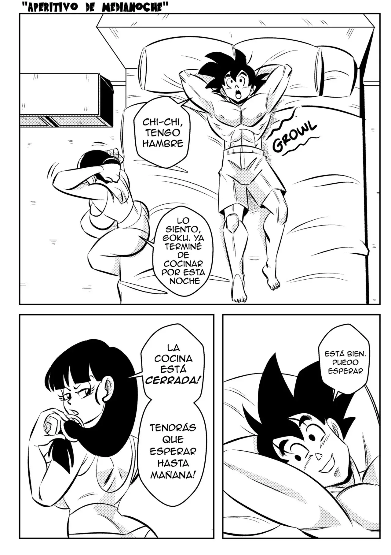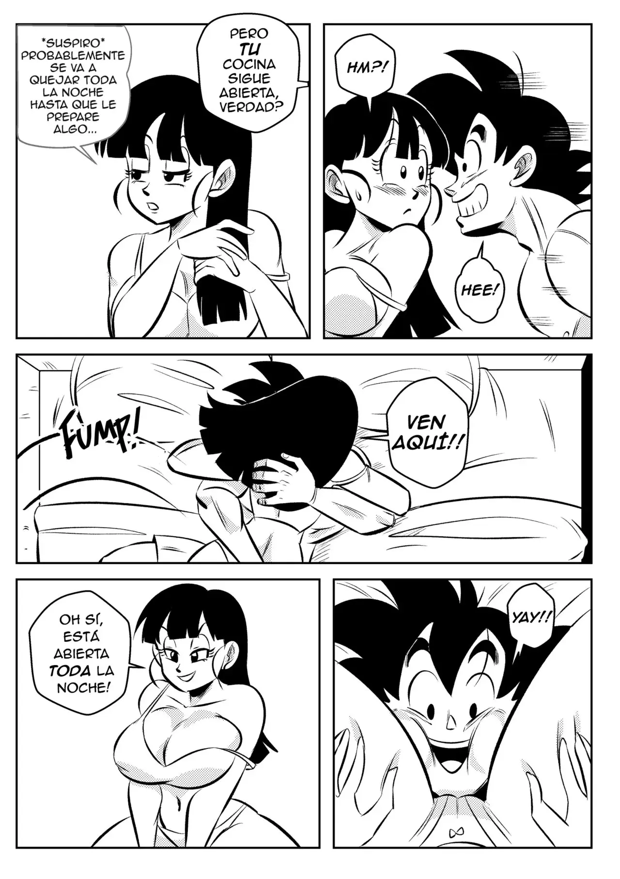 Goku está acostado en la cama y le dice a Milk que tiene hambre. Ella ya se estaba preparando para ir a dormir, así que le dice que lo siente y que ya terminó con la cocina por esta noche. Aunque está dispuesto a otro tipo de aperitivo si la cocina de su esposa está abierta. Llevándola a la cama para que pueda probar de su coñito mientras ella le dice que esa cocina está abierta toda la noche. Es bueno que su esposo tenga tanto apetito. Lo que le lleva a devorárselo todo y a darle una intensa corrida. Lo único malo es que ahora él tiene hambre y hasta a ella se le ha abierto el apetito luego del orgasmo.