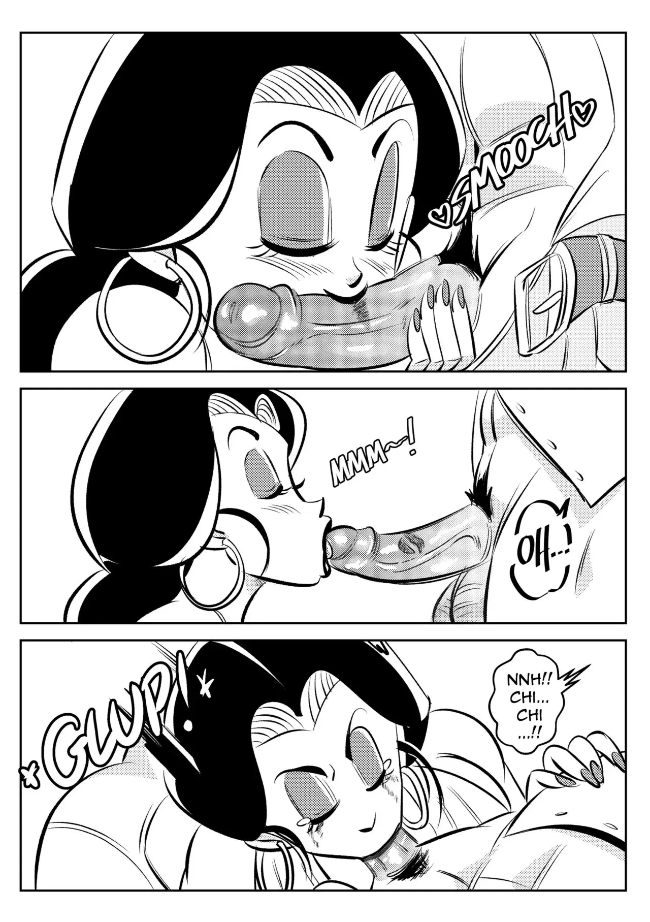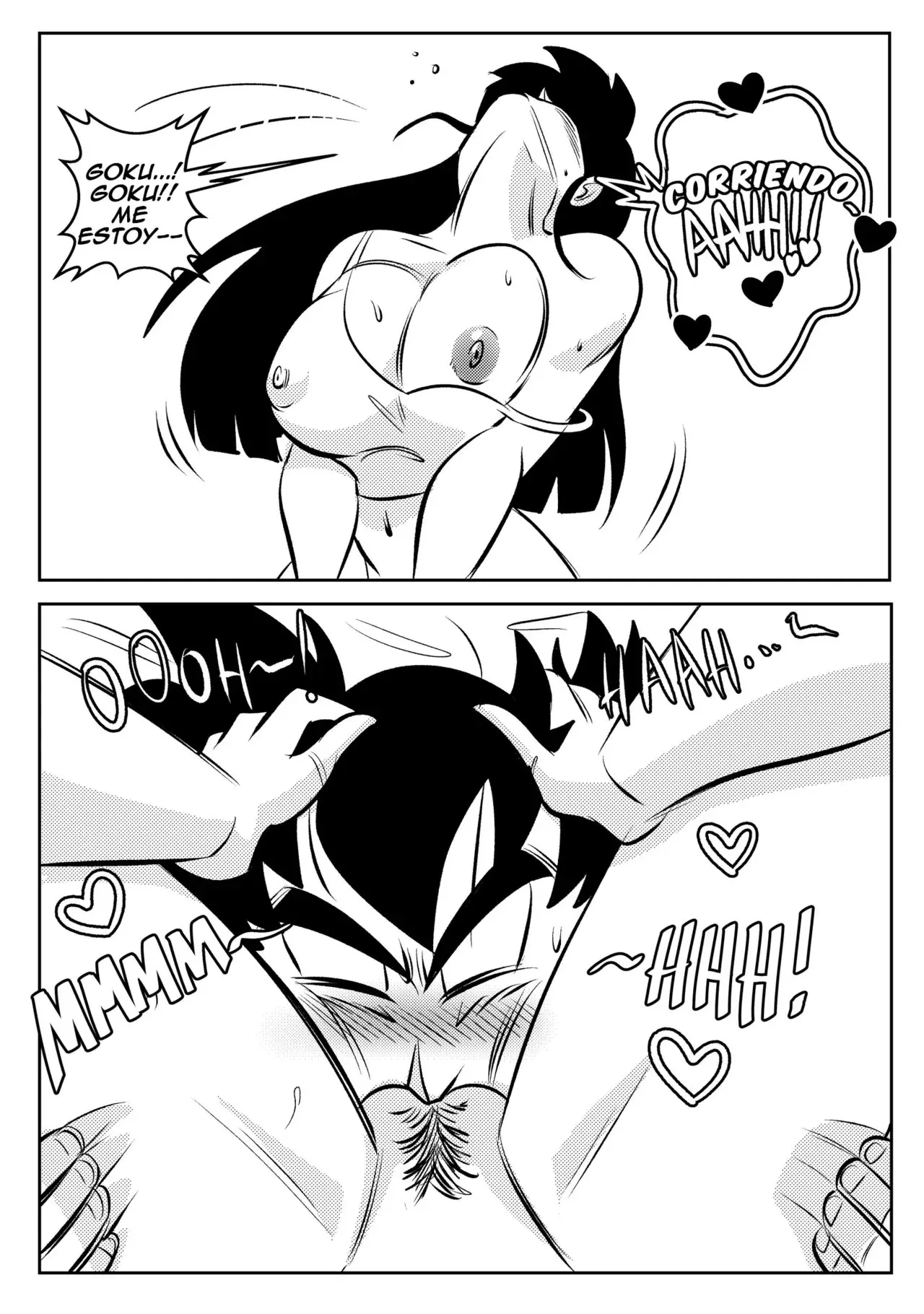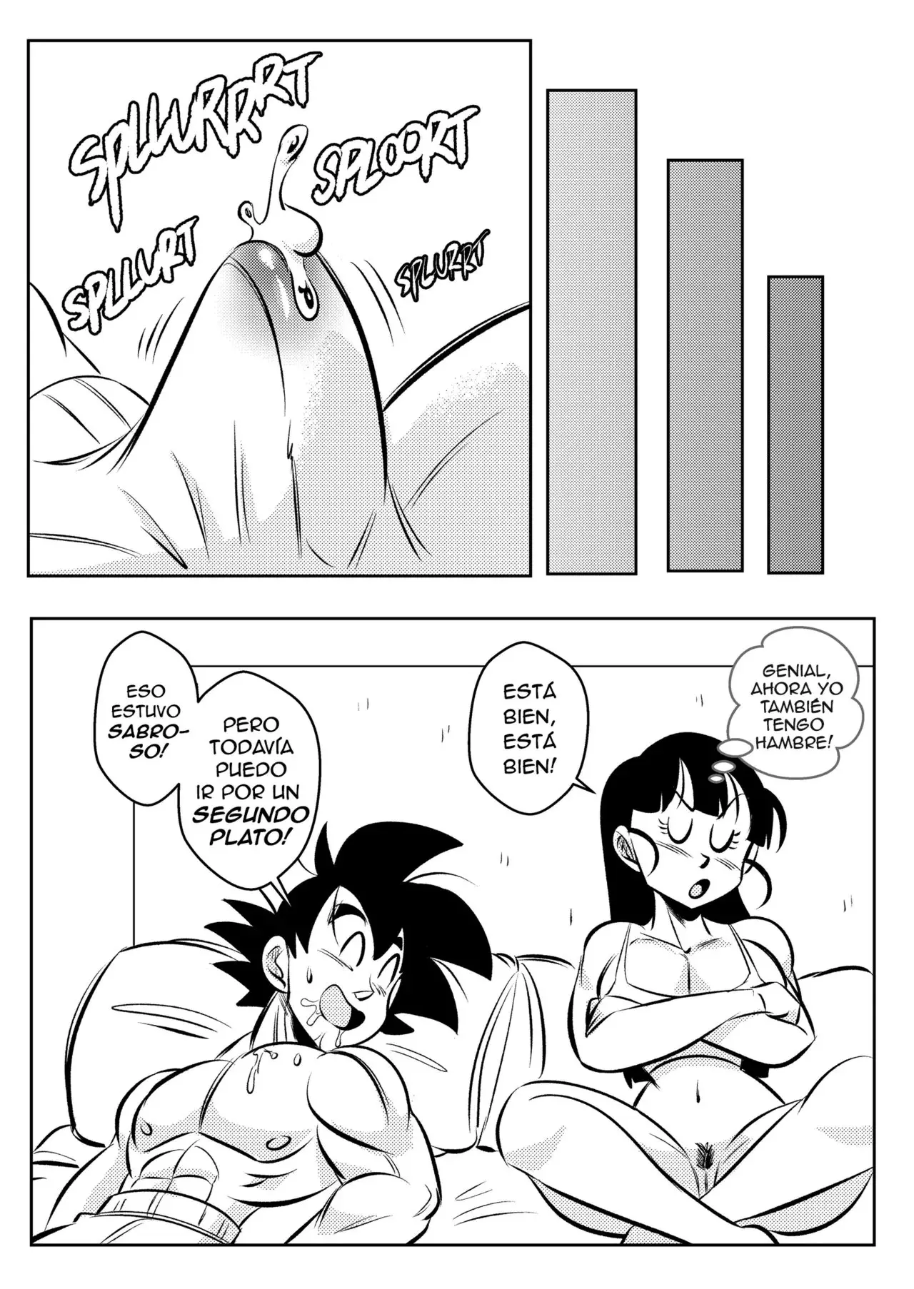 Ya en la cama, Goku se pone detrás y le pide que relaje sus hombros. Aún no está muy segura de esto, pero tras unos pocos cracks, ella comienza a sentirse de maravillas. Tanto que se recuesta y cierra los ojos mientras su marido hace todo el trabajo. Solo que Goku quiere que también se suelte un poco allí abajo, masajeando las gordas nalgas de su esposa. Ella no está segura de si esto es parte de un masaje, pero según el Maestro Roshi es lo que debía hacer. Por ahora ella va a disfrutar y luego pensará en matar al viejo.