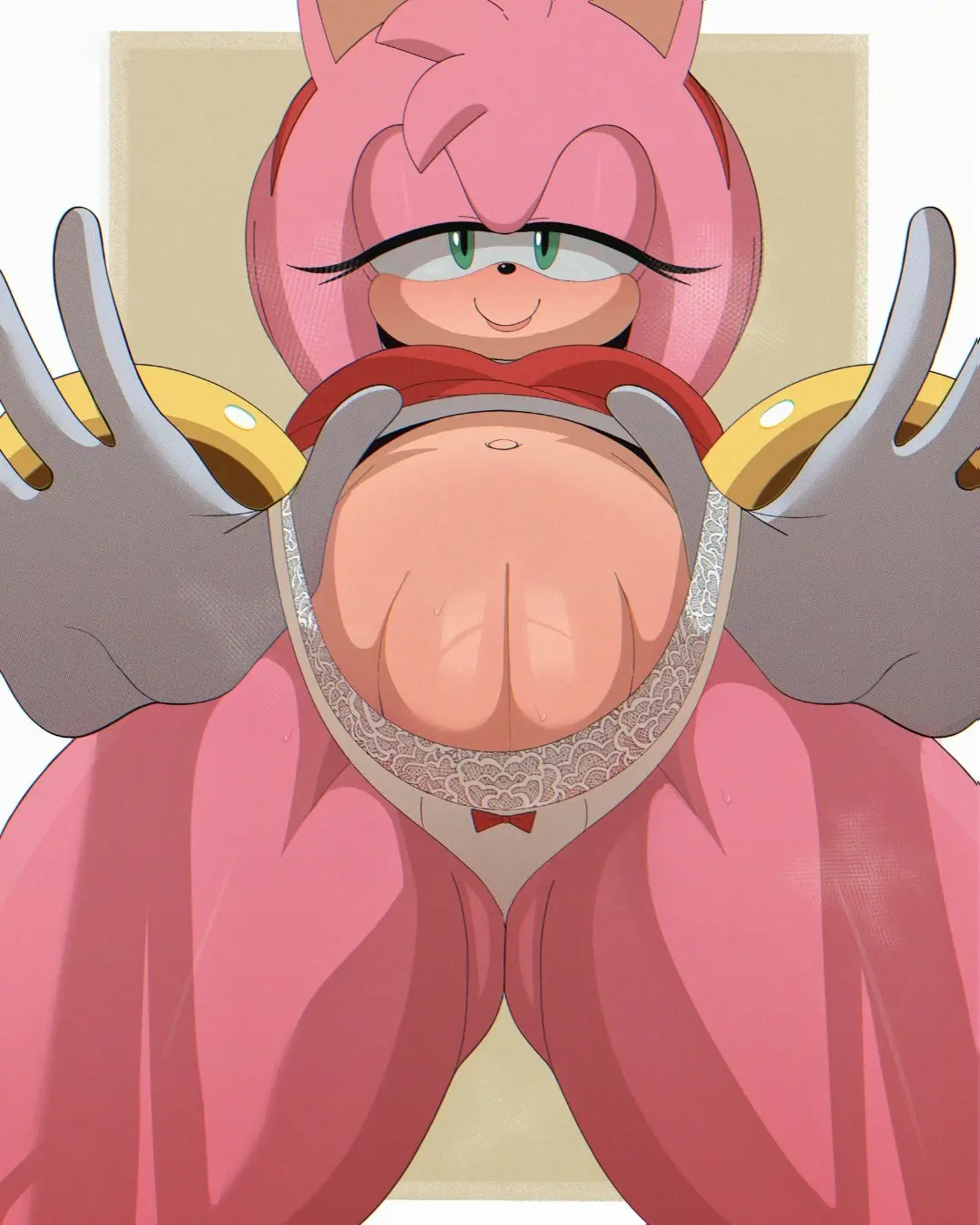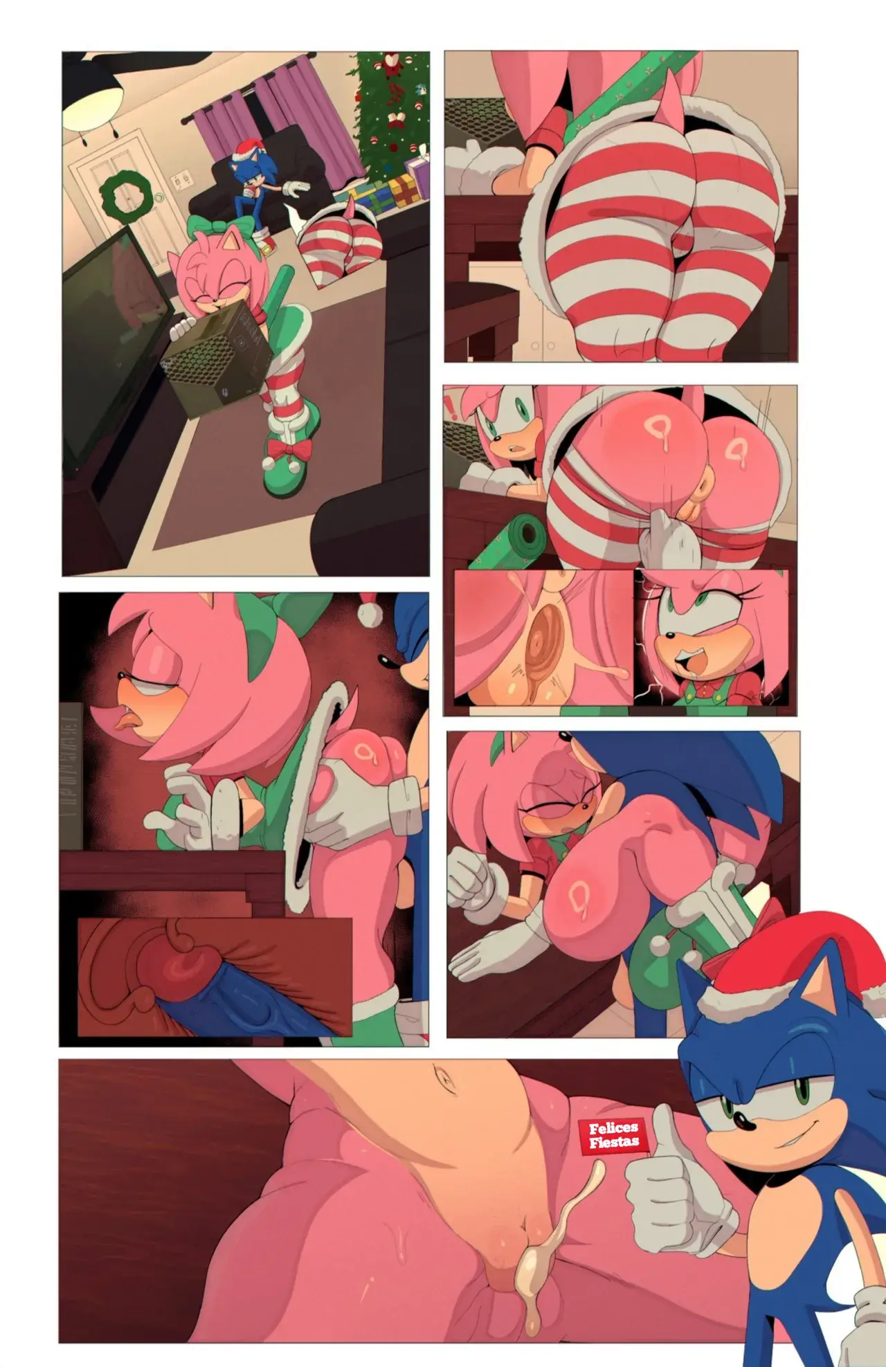 Por otro lado, es Navidad y Amy tiene puestas unas calzas a juego con la situación; le quedan tan jugosamente apretadas que Sonic se las baja para poder verle el coño. Y meterse dentro de ella.