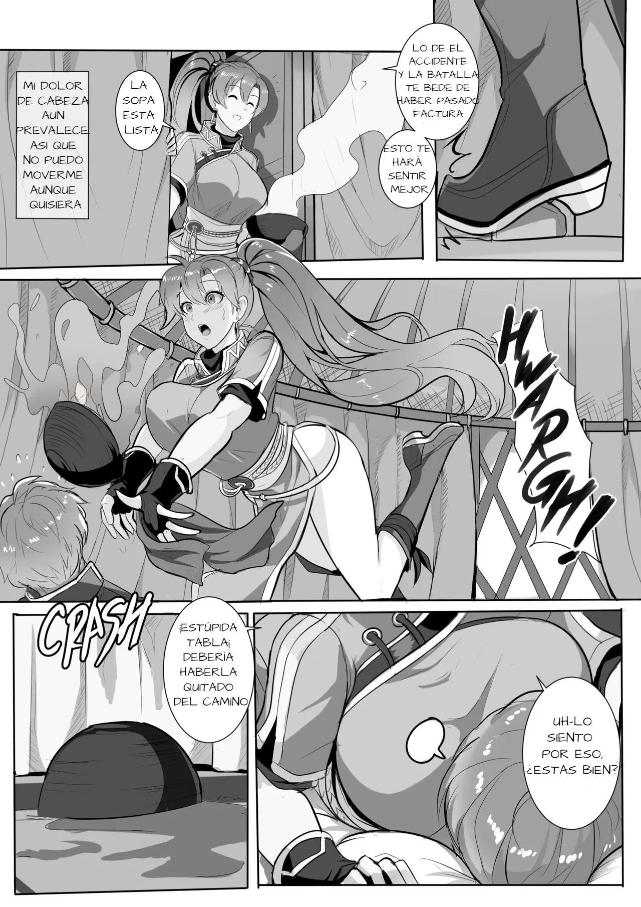 Por eso comenzó a tener sentimientos por ella, y también por su figura. Era imposible no distraerse con el cuerpo de esta mujer. Pero aunque ella es muy ágil en el campo de batalla, algunas veces puede ser un poco torpe. Lo que lleva a que tropiece como cuando le traía un tazón de sopa y cayó con sus tetas sobre la cara del muchacho.