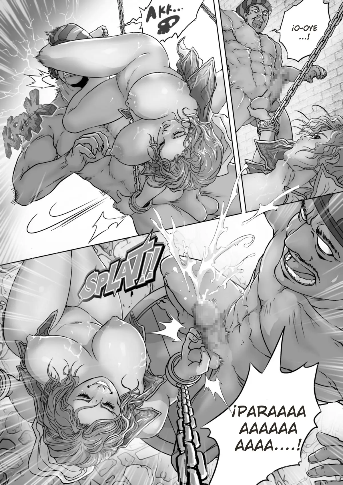 Mientras los guardias la sostienen, el hombre que la interroga la masturba tan fuerte que ella solo puede gritar. Haciendo que su coño se moje ante la mirada de los hombres. Los mismos que se han quitado la ropa ahora para poder follarlas ellos mismos. Y no solo por su coño, su interrogador pasa directamente a su culo. Mientras ella pregunta al tipo de adelante qué le hará con ella. Siendo obvio que le hará una doble penetración, le guste o no.