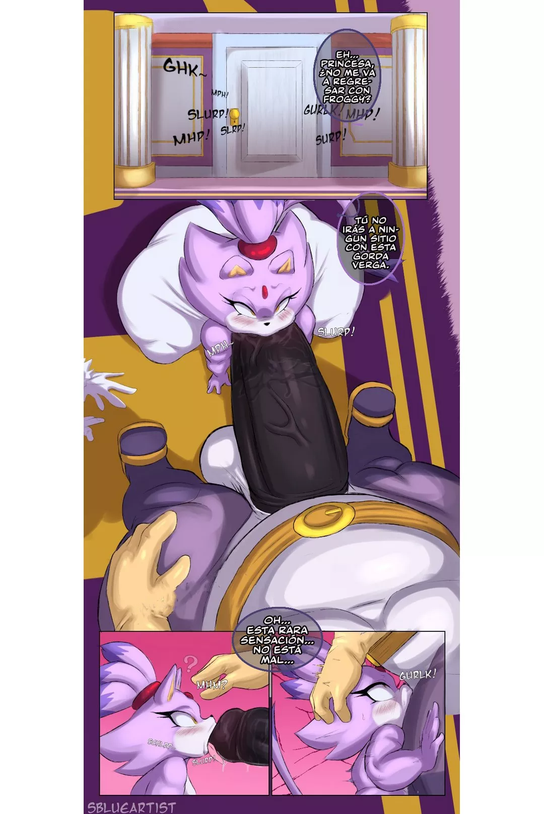 Blaze tiene su trasero tan enorme que se le rompe el pantalón al agacharse, pero parece que eso es justamente lo que estaba queriendo que pasara. Ya que eso le facilita que se pueda montar en Big. Blaze no sabe cuánto tiempo va a poder aguantar esta polla tan grande, pero mientras lo haga, quiere estar encima y moviéndose. Big ya ha empezado a tomarle el gustito a esto y también comienza a empujar. Big se preocupa de que esté saliendo agua blanca; claro que esta agua blanca es la corrida de este inocente ser, que ha sido semisecuestrado por la princesa y lo tiene de rehén para utilizar su polla.