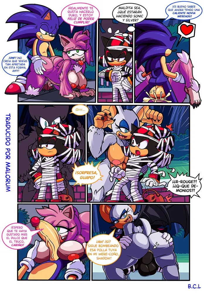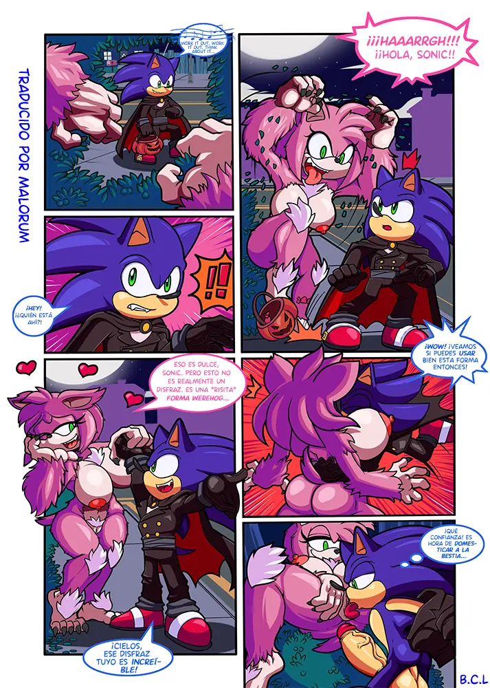 Las tres se separan para ir en busca de sus víctimas; Amy busca a Sonic saliendo de los arbustos e intentando asustarlo. Sonic piensa que esto es un disfraz y lo pone tan caliente ver tan enormes pechos en Amy, que se prende con sus brazos de la cintura para ahogar su cara en esos enormes pechos. Amy, que ahora está en el suelo, se abre de piernas para que Sonic le haga un hermoso sexo oral. Sonic, que ya estaba bien duro desde el momento en que saltó sobre ella, empuja su pene en ella y luego lo hace en forma de perrito, sintiéndose muy apretado en el coño de Amy.
