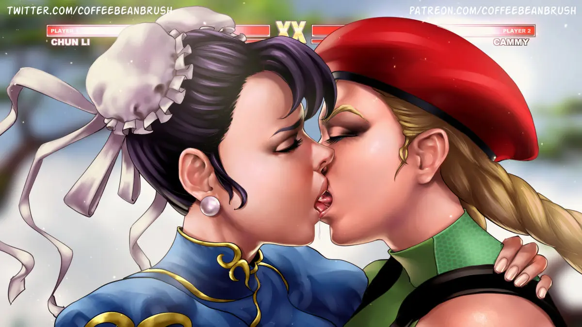 Chun-Li y Cammy estaban peleando cuando decidieron dejar de darse patadas y golpes de puño para besarse en la boca. Estas chicas están calientes, y no planean solo tener sexo lésbico en esta aventura donde sus barras se han vuelto rojas de lo calientes que están.