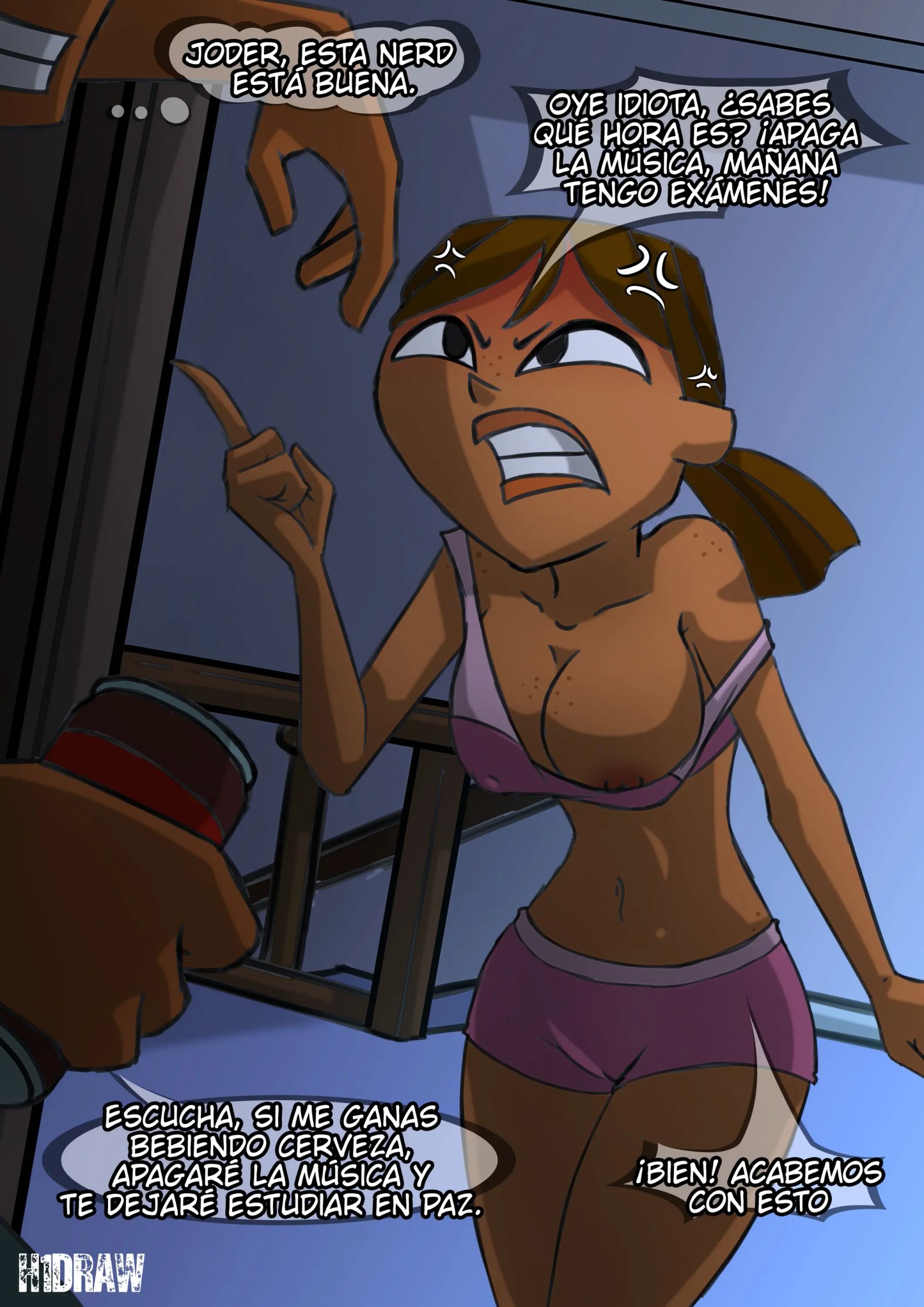 Un hombre piensa que Courtney es una nerd que está buena, cuando ha aparecido semidesnuda para decirle que apague la música porque mañana tiene exámenes. Lo que acepta hacer solo si ella le gana en un concurso de beber cerveza.