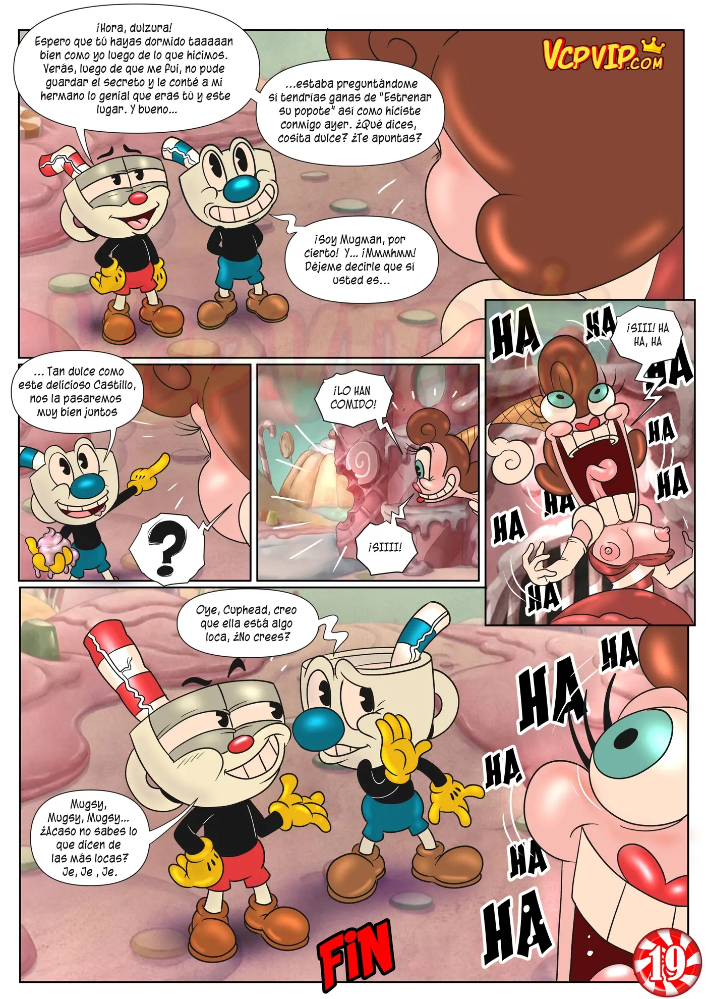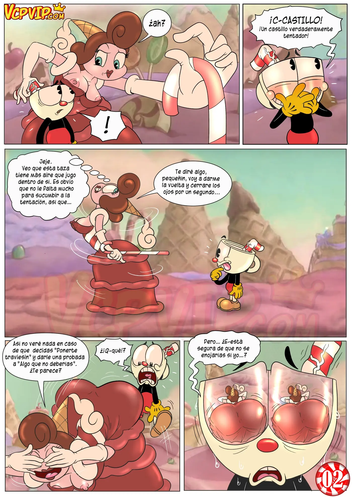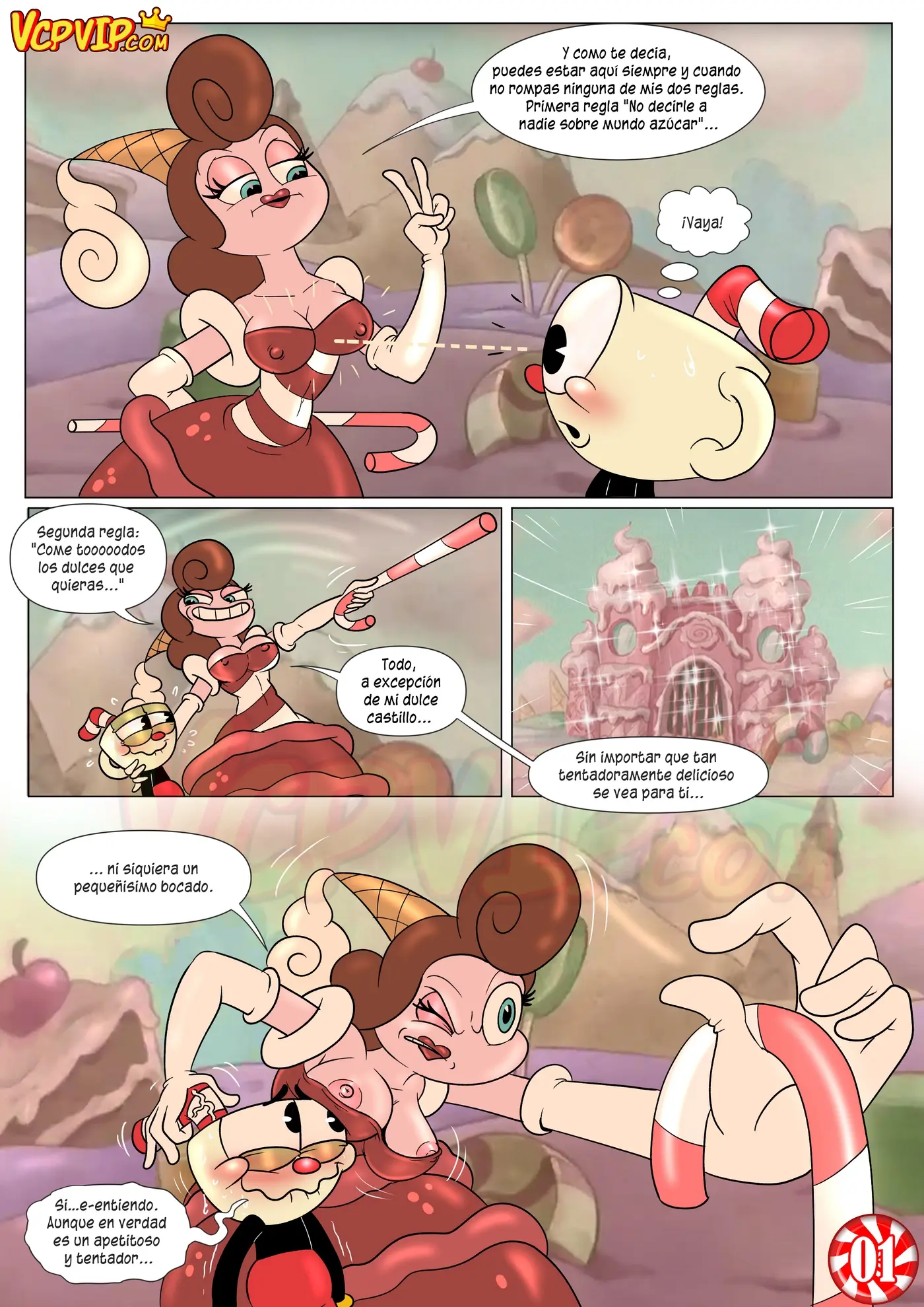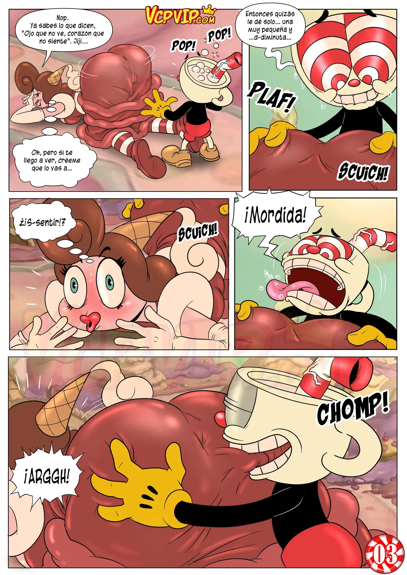 Eso hace enojar a la Baronesa, porque no es la forma de referirse a la realeza. Por eso Cuphead compensa su ofensa usando los cachetes de su culo para hacerse una paja. Lo cual también ha tentado a la mujer. Que intenta disuadirlo de comer algo de allí, pero acaba siendo penetrada por la polla del chico, que prefiere esta forma de comer sus dulces.