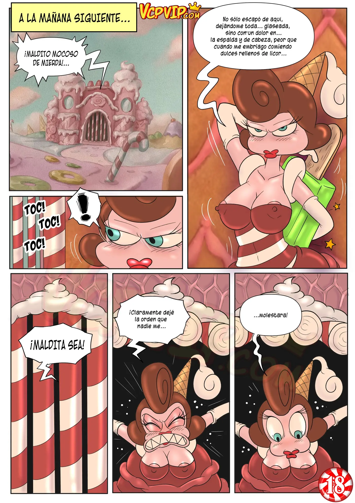 A la mañana siguiente, ella está muy enojada con el mocoso porque no solo escapó de su castillo dejándola toda glaseada, sino que con un dolor de espalda y de cabeza peor que cuando se embriaga comiendo dulces de licor.