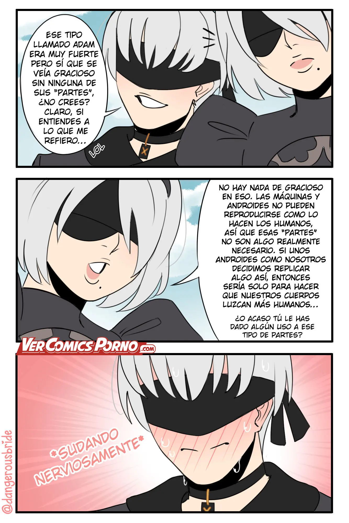 Esto se debe a que antes 2B se había burlado de ese tipo llamado Adam porque era muy gracioso que le faltaran partes en su entrepierna. Pero para 2B no tiene nada de malo, cuando los androides no tienen sentimientos y no necesitan gastar recursos en tener órganos sexuales. La única finalidad sería que ellos se vean más humanos, a menos que 9S le haya dado uso al suyo.