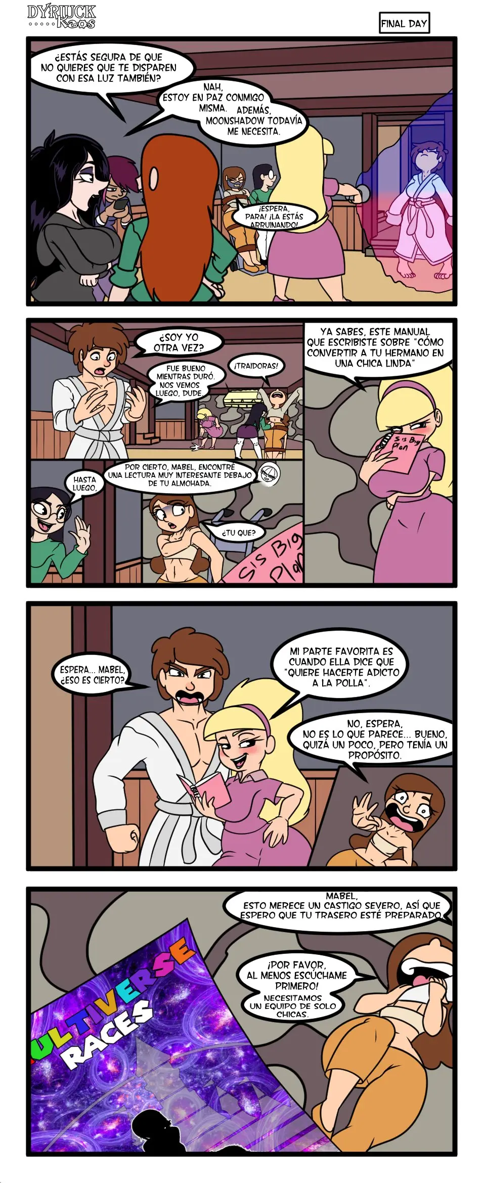 Ya lleva un día completo Dipper así, y Mabel no puede soportarlo. No entiende como si son gemelos, él tiene los pechos más grandes que ella. Se ve claramente que no son gemelos idénticos, según los ojos de Wendy, de inmediato las chicas lo ven quieren acostarse con él.