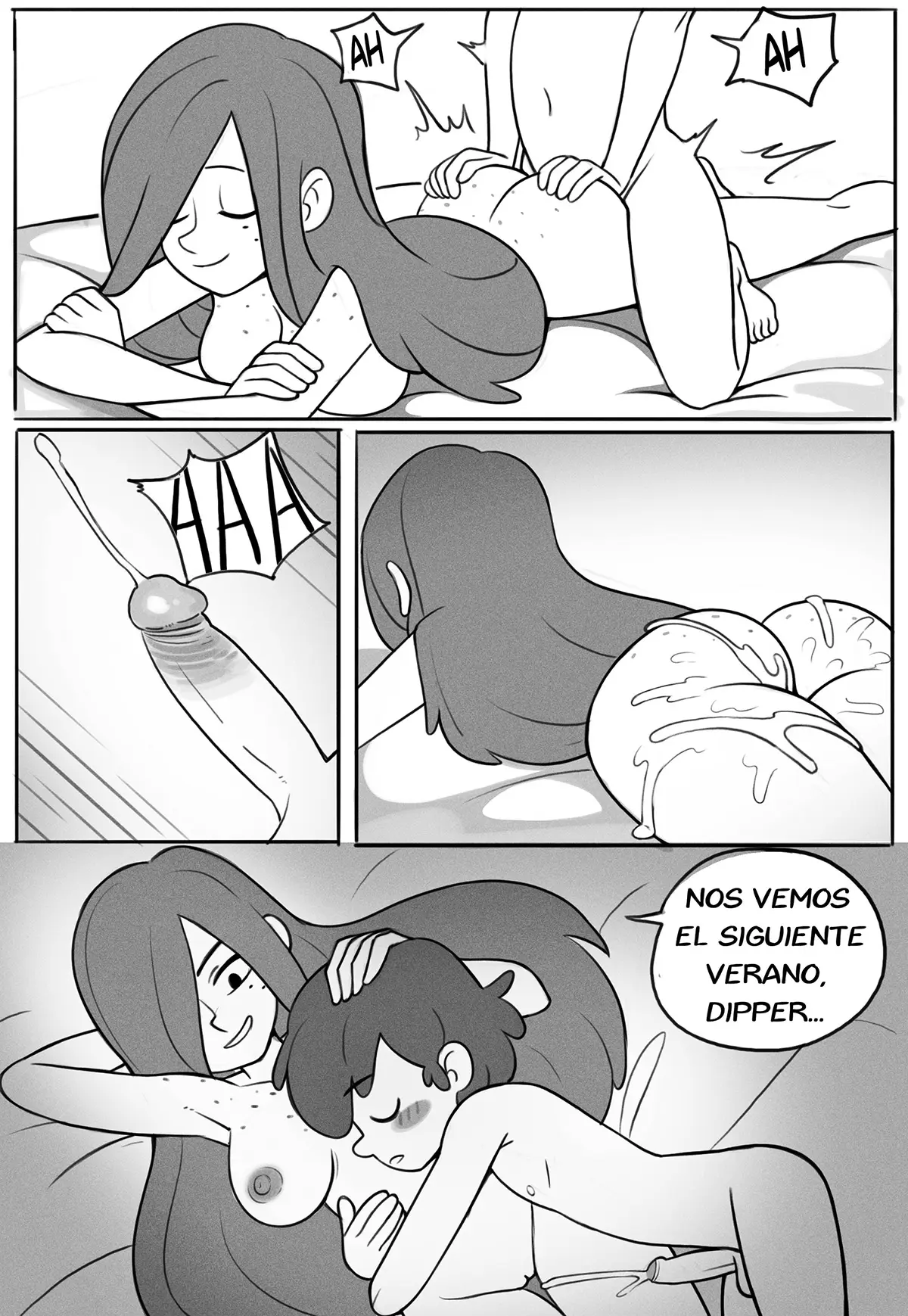 Dipper con esto ha entrado en total confianza y sabe que debe aprovechar este momento, que quizás nunca se vuelva a repetir, por lo que mientras Wendy está acostada boca abajo en la cama, toma su trasero pecoso fuertemente con sus manos, y empuja dentro suyo para terminar muy rápidamente en todo su trasero, esparciéndole su semen en todo su cuerpo.