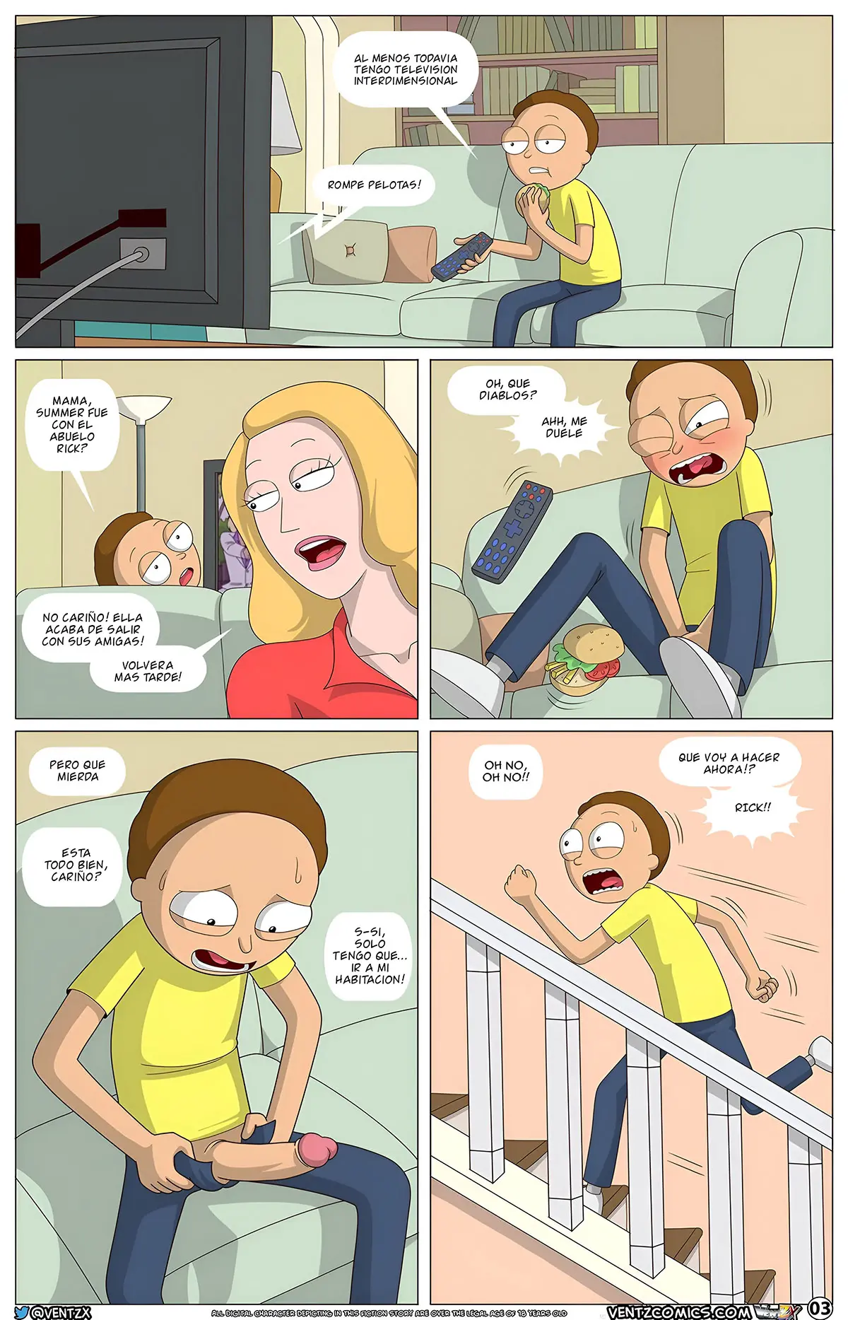 En la habitación, Morty también tiene sus propios problemas, porque su polla ha crecido el doble de tamaño y necesita contactar a Rick lo antes posible. Aunque se siente tan mareado que termina en la cama. Allí no puede pensar con claridad y solo puede imaginar a su hermana, madre y Jessica en ropa interior y viéndose muy sexis.