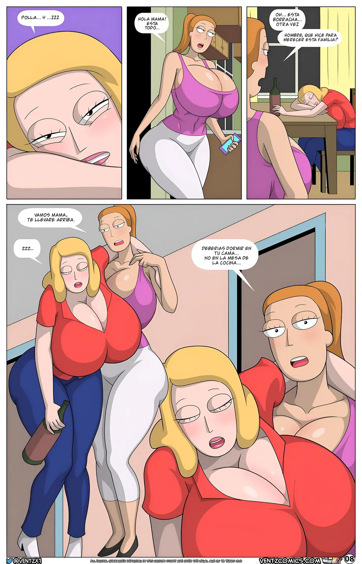 Beth también está teniendo sus propios sueños eróticos, donde un grupo de Mortys con antifaz han aparecido con sus penes crecidos. Una mezcla entre una pesadilla y un sueño húmedo, porque son versiones de su propio hijo que están desgarrando la ropa de la madura. Ella no sabe qué hacer con tantas pollas, y menos siendo las de Morty, pero su cuerpo está tan excitado y siente tanto calor que se deja llevar sujetando todos los rabos con sus manos. Al final piensa que son todas tan lindas que lo disfruta. Lamiendo, haciendo pajas y metiéndolas en todos sus agujeros. Algo mucho mejor que lo que suele hacer con Jerry. Al final termina con todas las corridas, pero también corriéndose ella misma por servir a Morty.