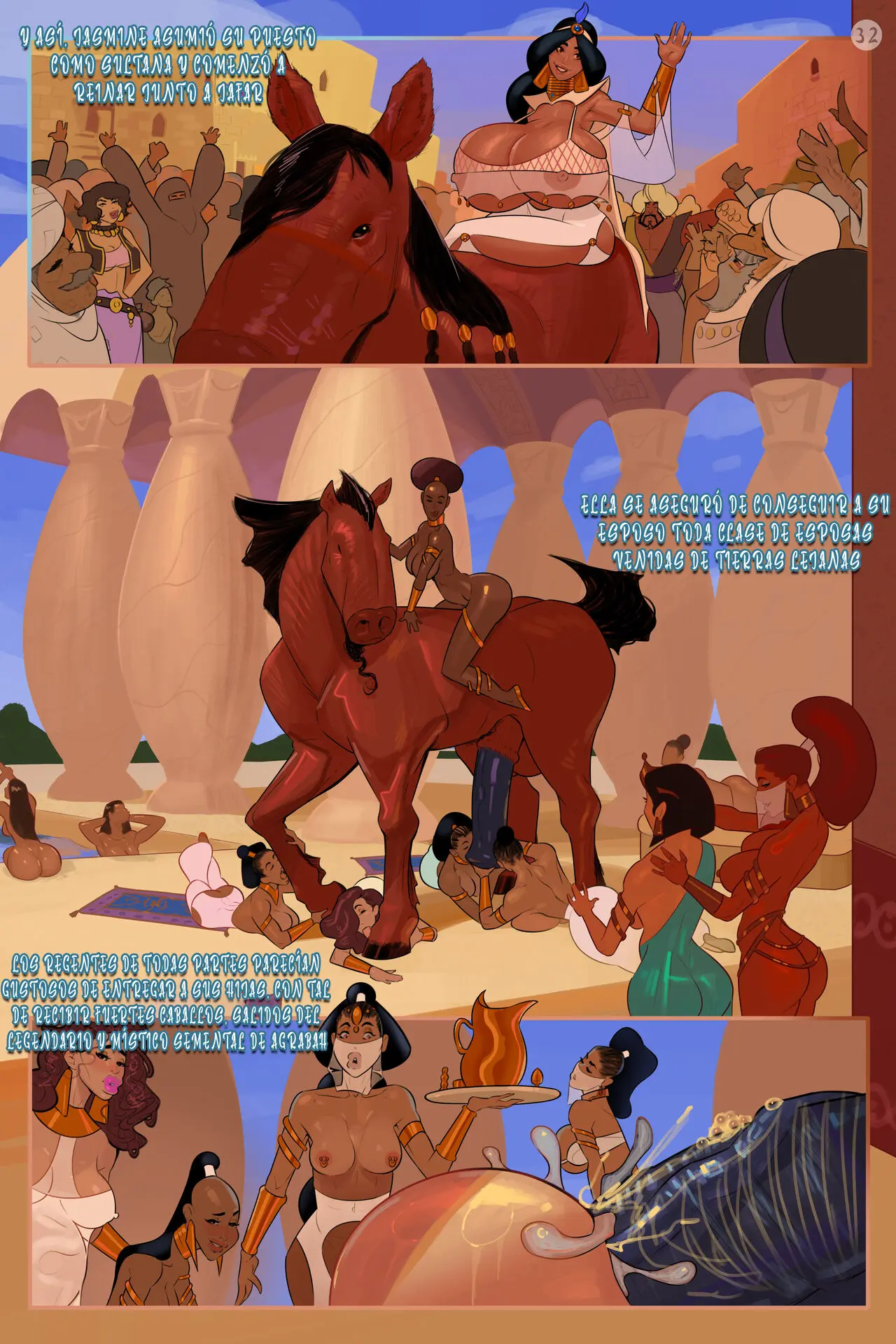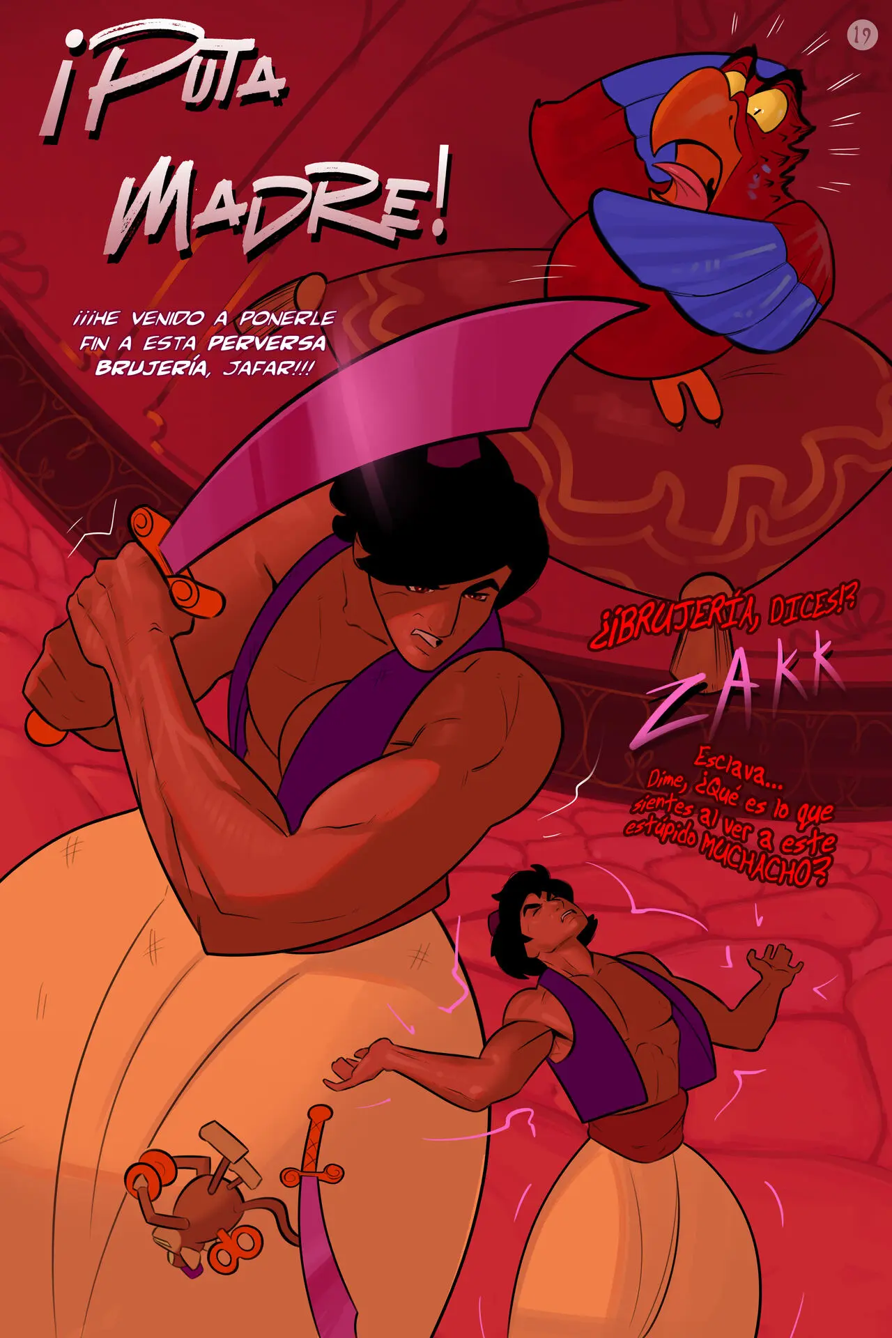 Un genio rojo y maléfico, que resulta ser Jafar, intenta intimidar a Jasmine, la Princesa, hija del sultán de Agrabah.  No lo hacía en un principio, hasta que se saca una polla enorme que hacen que Jasmine caiga hacia atrás y que se le haga agua a la boca. Que es cuando el genio le pregunta “¿qué es lo que decía?”.