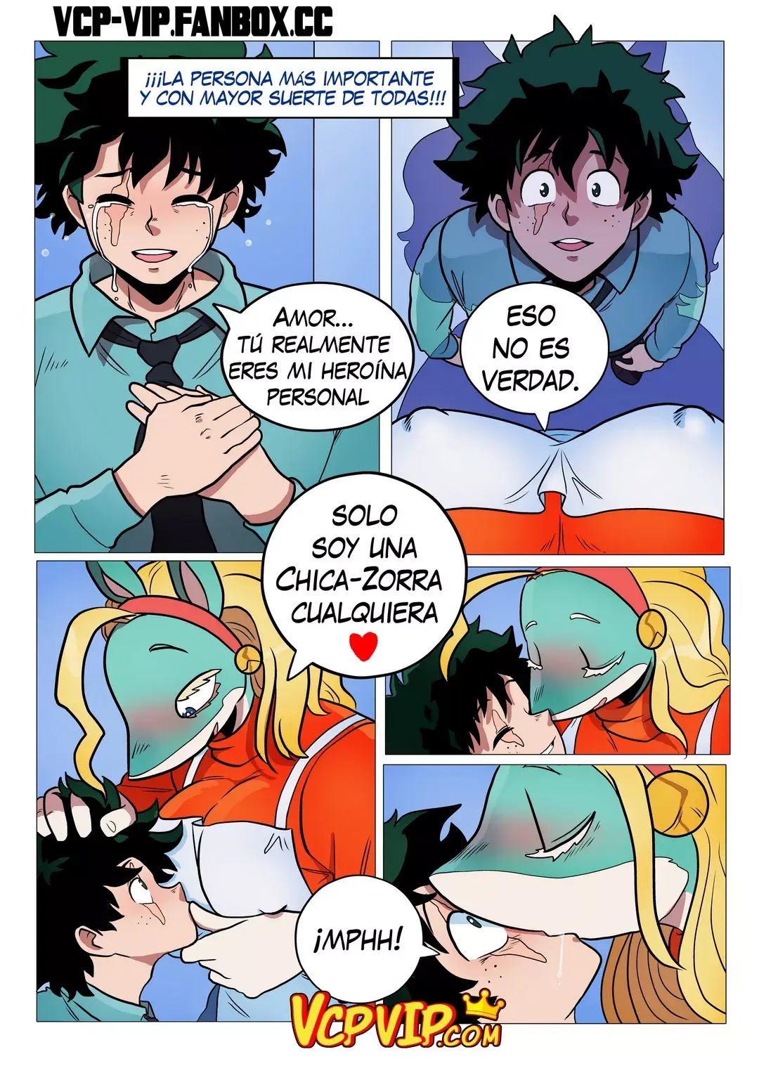 Pero no le gusta que él ponga esa cara, porque eso le hace imposible controlarse y ser amable con él. Esto lo dice mientras se quita la camiseta y se queda en bragas subidas a él. Midoriya es un héroe profesional, pero hasta él siente algo de terror cuando se vuelve así. Lo cual no debería, porque solo busca hacerlo muy feliz poniendo su verga entre las nalgas.