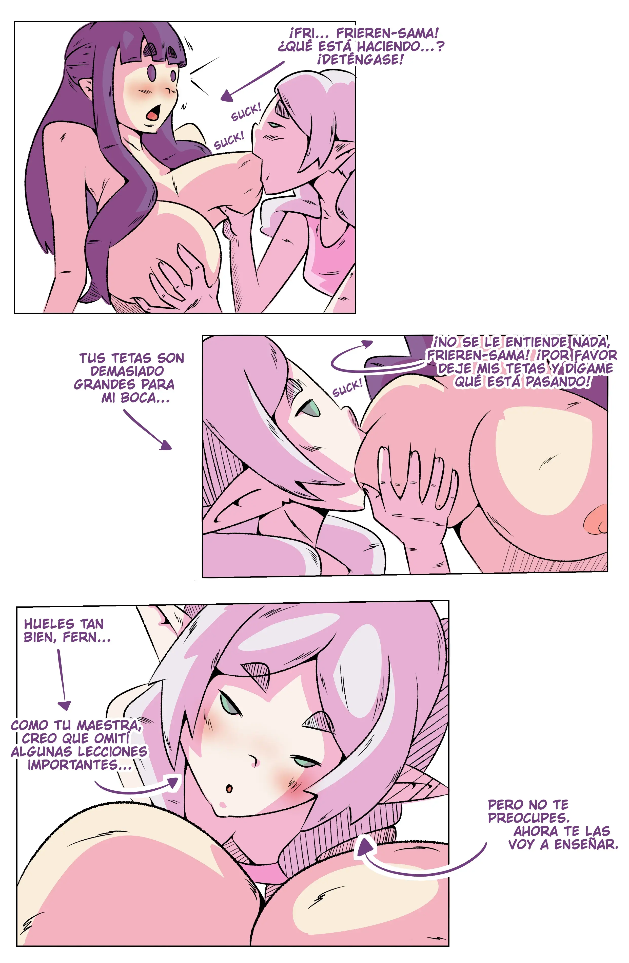 Fern hace un berrinche, que a Frieren le recuerda los que hacía cuando era una niña pequeña. Pero se encandila con esas dos grandes tetas y no puede evitar tomarlas con sus manos, apretarlas y llevarse una a la boca. Mientras Frieren chupa con fuerza uno de los pechos de Fern. Fern le pide que se detenga, pero Friren succiona con más fuerza, mientras intenta decir que estos pechos son demasiado enormes para su boca.