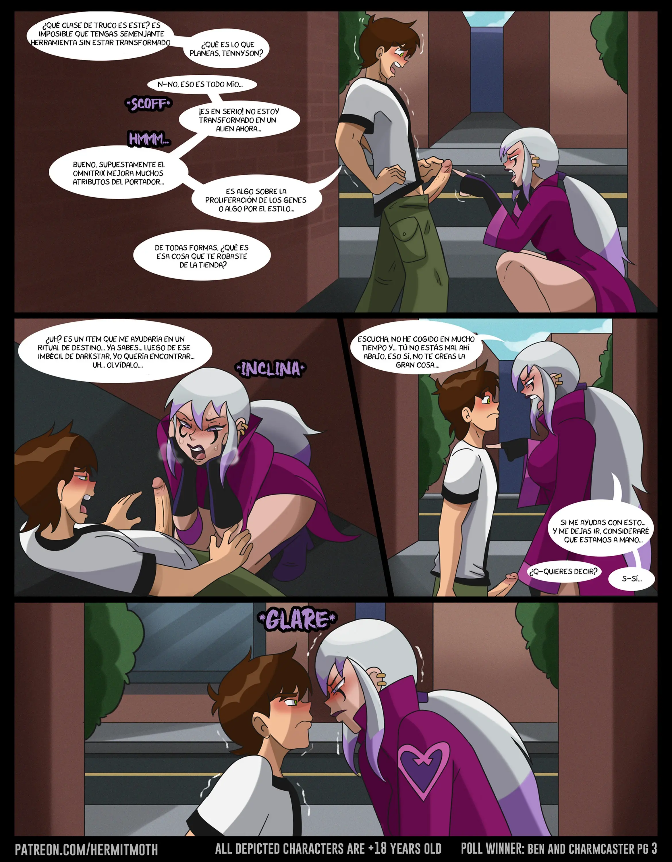 Charmcaster quiere usar su verga para un ritual. Tampoco ella ha cogido en mucho tiempo, así que esto podría ayudar a ambos si el chico está así y necesita un alivio. Por lo que ambos terminan en un callejón follando de parados. Ella de espaldas a Ben mientras le pide que solo siga haciéndoselo.