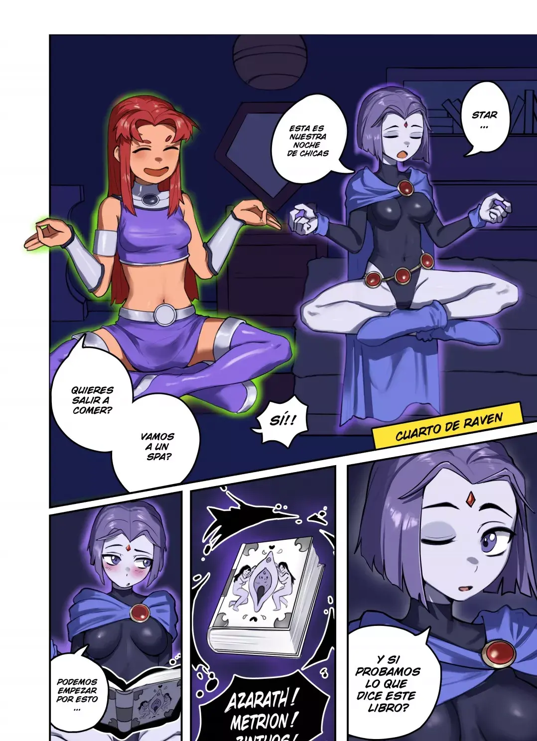 Esta noche de chicas entre Raven y Starfire, no es una noche para todas las edades. Que comienza en el cuarto de Raven, donde ambas están flotando y meditando. Ese era el plan de Raven, pero Starfire preferiría ir a comer o a un spa. Ya sabes, cosas típicas de una noche de chicas.