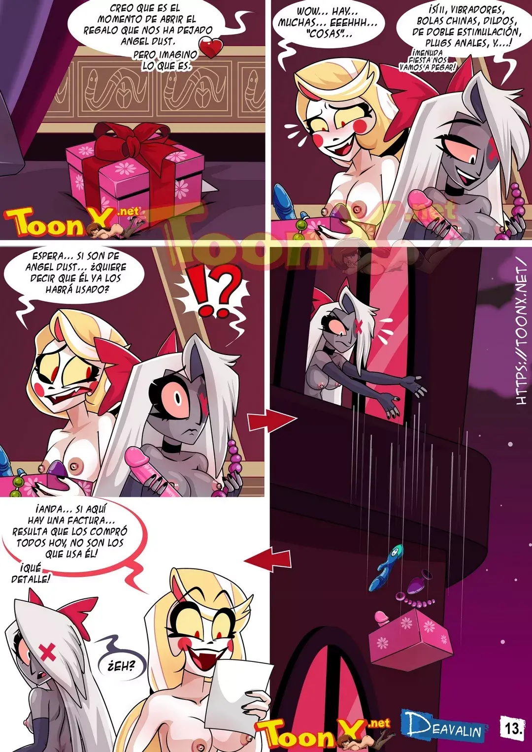 Mientras tanto, Charlie y Vaggie vuelven a lo suyo. Y recuerdan que deben abrir la caja de regalos que les ha dejado Angel; hay vibradores, dildos, bolas chinas, plugs anales. Pero se preguntan si todas estas cosas han sido usadas por Angel antes; sin embargo, hay una factura de compra que indica que son nuevas y las compró ese mismo día. Vaggie ya había tirado por la ventana la caja con los regalos, y se lanza batiendo sus alas en la búsqueda. De la caja cae un juguetito, un consolador con doble estimulación, que Nifty agarra muy felizmente y se lo lleva a tomar el té, antes de follárselo.