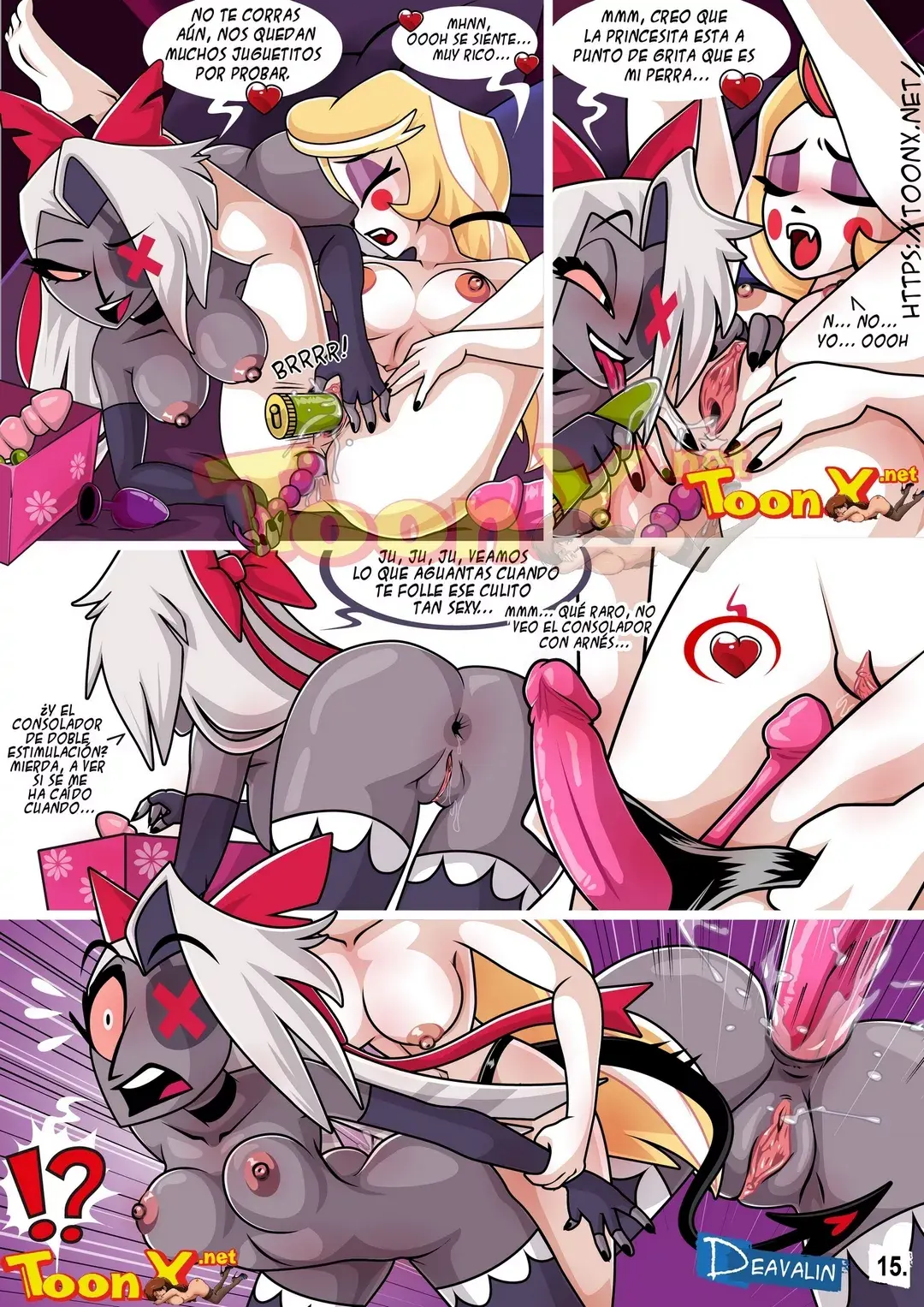 Cherry aún sigue gritando mucho en el pasillo y esto hace que Vaggie pierda la concentración, por lo que les grita que ya se vayan a su habitación. Cherry deja salir de su boca que estas pollas que ella tiene en la boca sí tienen verdadera leche. Lo que deja a Vaggie pensando en que quiere que Charlie se haga crecer una polla de verdad, pero Charlie no es ese tipo de demonio. E intenta calmarla diciéndole que si le gustaría ahora follarla a ella por detrás. Con esto, Vaggie rápidamente se olvida de que la tenía molestando y se mete con ese arnés doble dentro de Charlie. Pero parece no ser suficiente, ya que también se mete con consolador en el culo. Mientras a Charlie le chorrea el coño de lo muy mojada que está. Charlie está tan feliz que comienza a cantar una canción sobre el sexo anal.
