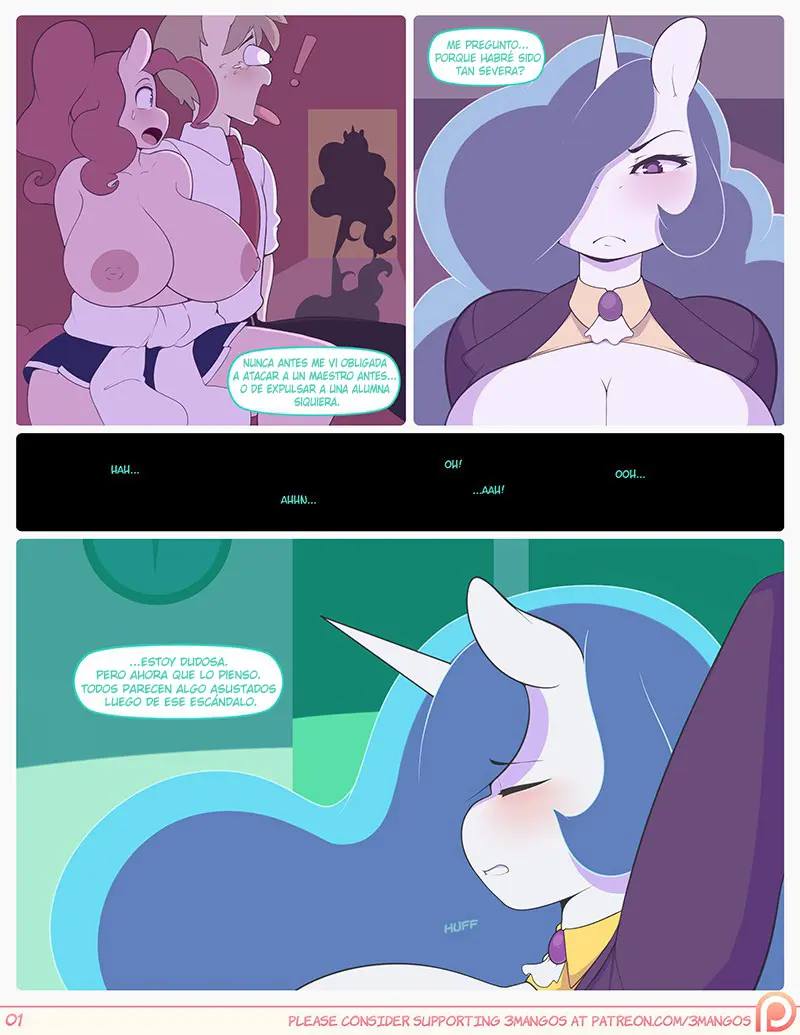 Como ya sabemos, Pinkie es una poni de lo más cachonda y esta vez ha seducido a un profesor. La directora los ha encontrado juntos y ha tenido que ser muy severa expulsando a Pinkie y atacando al maestro. Nunca antes había tenido que ser así, y esto la pone pensativa.
