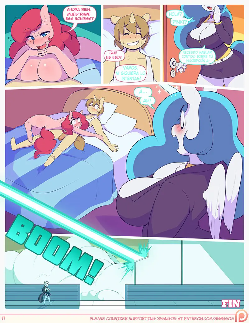 El profesor se toma de los pechos a Pinkie, sintiendo que son dos enormes buñuelos. El profesor está por terminar; Pinkie le pregunta dónde quiere hacerlo. Mientras Pinkie está de espaldas al profesor, él la toma con sus manos, apretando ese gran trasero y diciéndole que es ahí donde quiere terminar. A Pinkie esto le parece fabuloso. Pero antes de que lo haga, necesita que se ponga un poco agresivo, hasta hacerla gritar. Esta toma el trasero de Pinkie con sus manos y se lo lleva a su rostro para poder lamerle bien el coño. Luego la toma nuevamente con sus manos, metiendo dos dedos en el ano de Pinkie y estirando para poder entrar.