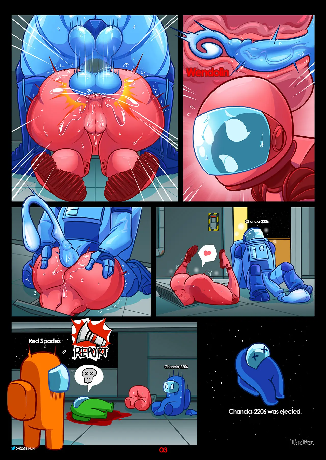Una escena muy difícil de explicar para otro tripulante cuando llega y encuentra a uno asesinado, otro atrapado en el conducto y uno sentado en el lugar. Por eso piensa que el que se follo a la verdadera impostora es el asesino y lo reporta para que sea expulsado de la nave.