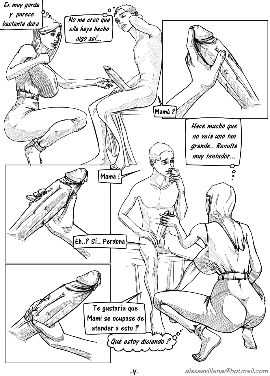 Ella se disculpa y ambos piensan que es vergonzoso. Aunque para la madre no hay razón para sentirse incómodos cuando ya lo ha visto sin ropa antes. Por eso le ayuda a quitarse la sabana que usa para cubrirse, porque quiere ver que tanto le ha crecido la polla.