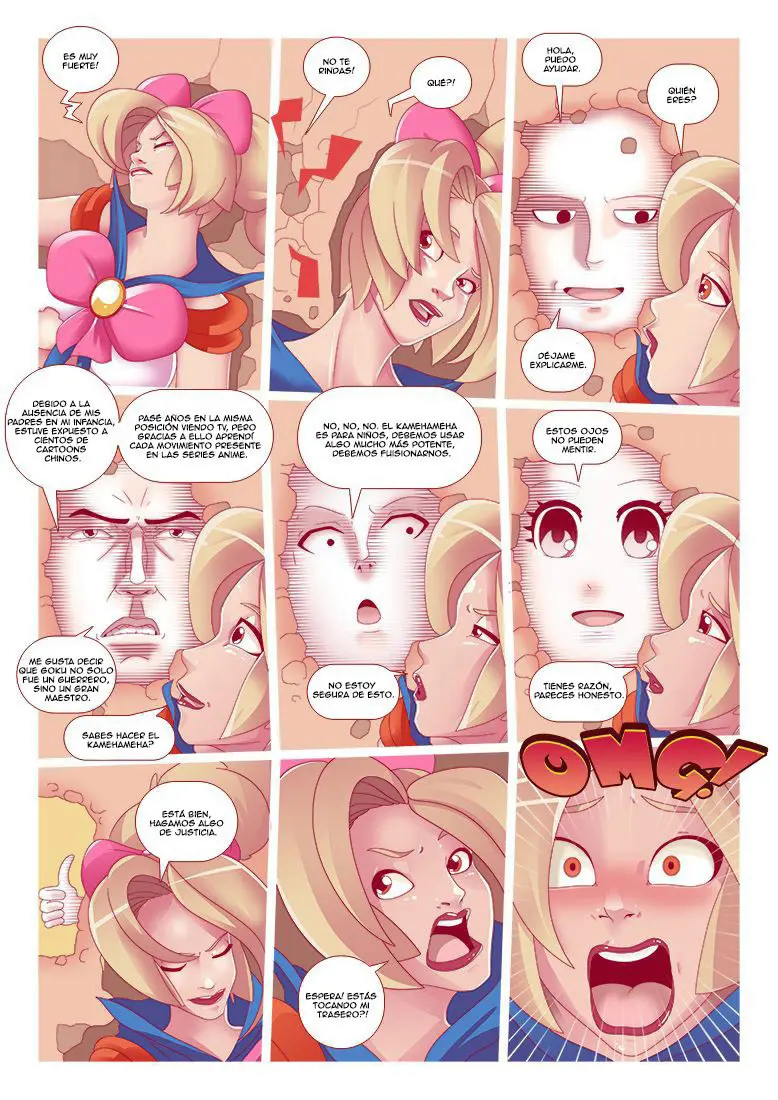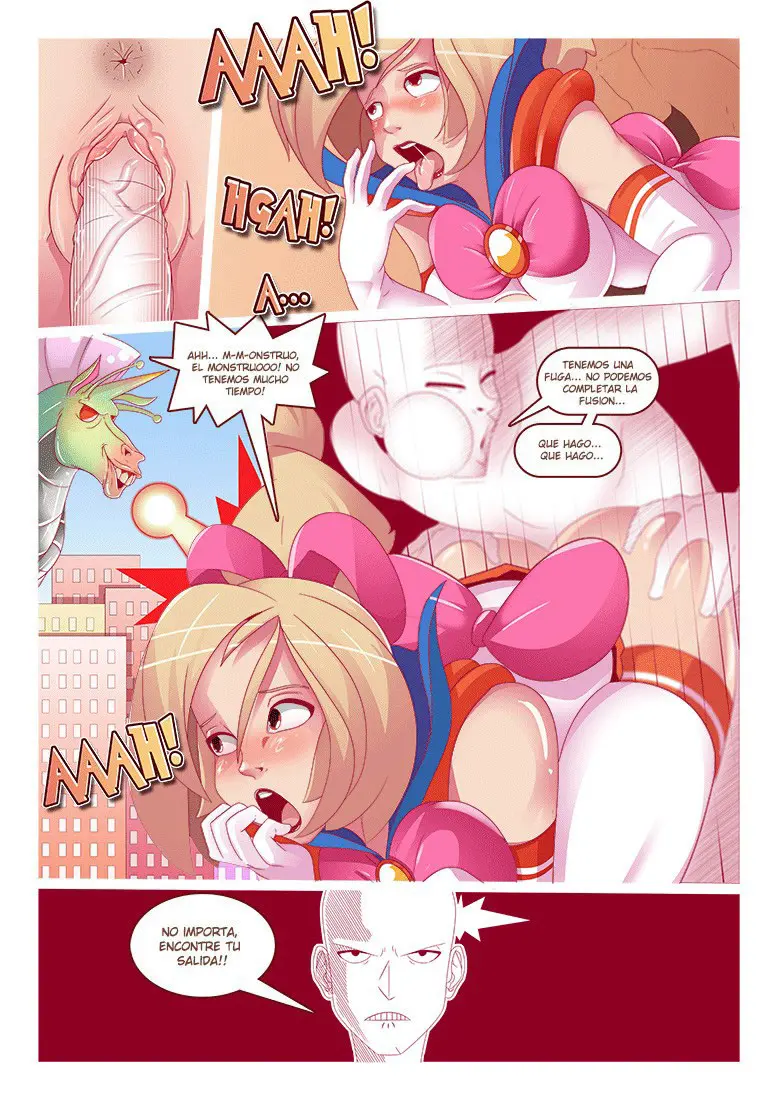 Este maldito pervertido está tocando su trasero, y si eso no es aprovecharse de la situación, aún hay más. Acerca su blanca polla desnuda y, corriendo a un costado la braga de Venus Pink, se mete en su coño. Diciendo que esta es la fusión. Venus Pink se ve molesta y le pregunta qué es lo que cree que está haciendo, ya que ella pensaba que iba a usar unos aretes mágicos para fusionarse o algo así como en Dragon Ball. Pero Saitama desestima esto diciendo que él vio un nuevo episodio con algo mucho mejor, más práctico y rápido; solo necesita mantener su polla dentro para unir sus poderes.  Venus Pink realmente prefería los aretes. Pero Saitama no está escuchando esto, ya que está solo pensando en lo muy estrecho que se siente este coño.