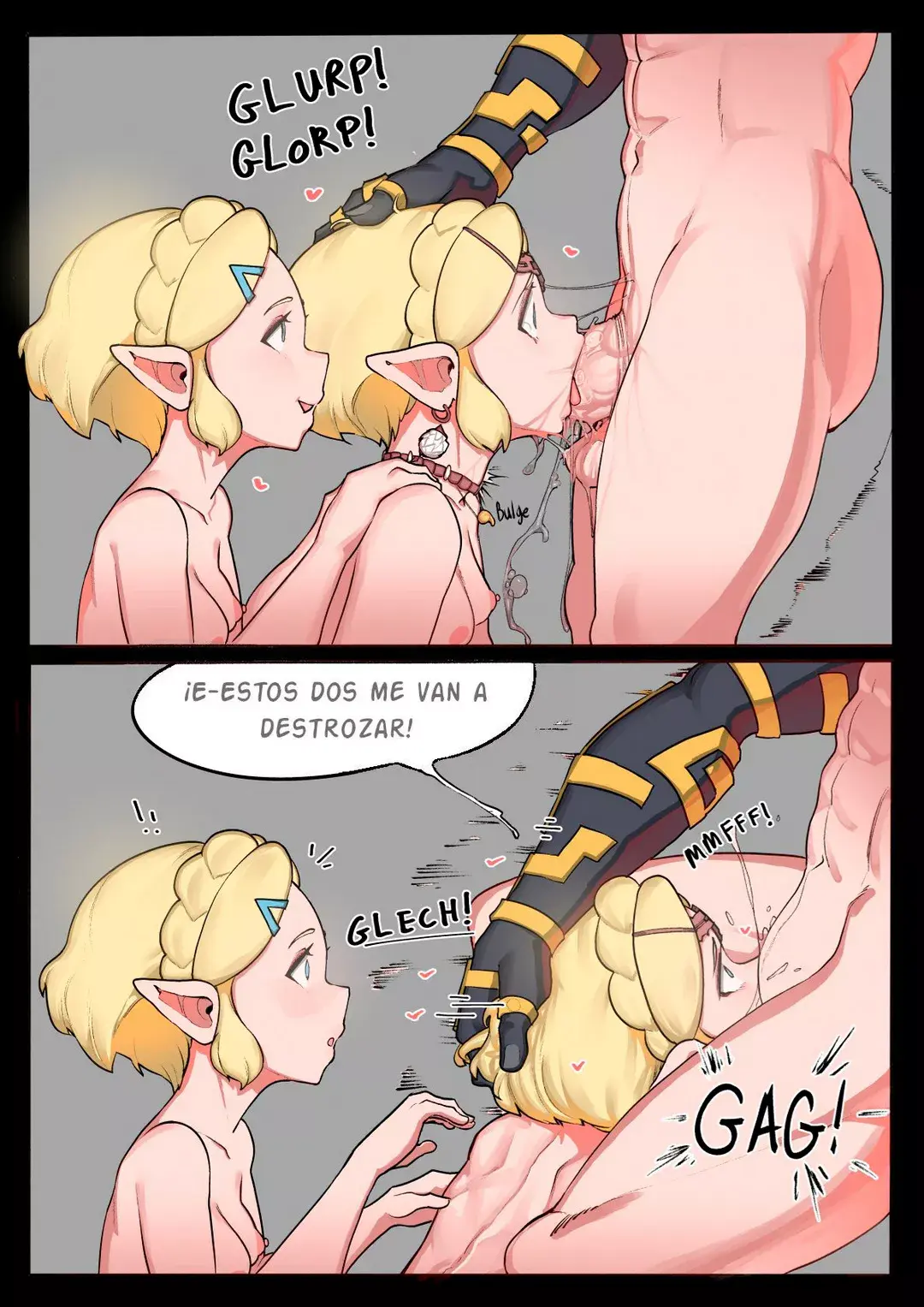 Zelda aún no se convence, así que le pide a la impostora que se ponga en el suelo boca arriba y le pide que se la trague toda. Todo mientras Zelda se sube encima de esta chica y la masturba. Luego, mientras la polla entra por su garganta, la propia princesa lame el cuello de la chica como una especie de fetiche. Que incluso llega a excitarse con los sonidos que hace la impostora. Son gemidos ahogados por la gran verga, pero la están mojando.