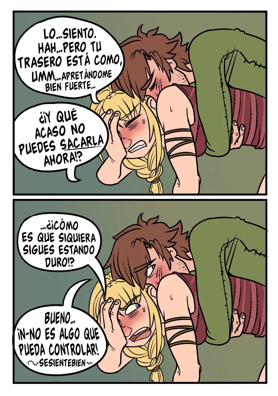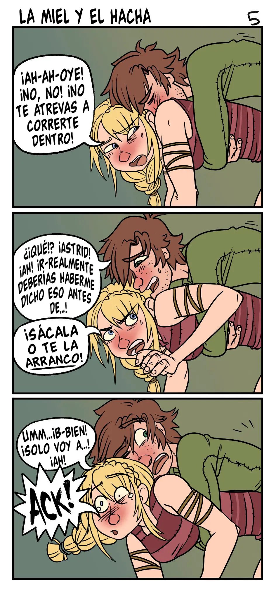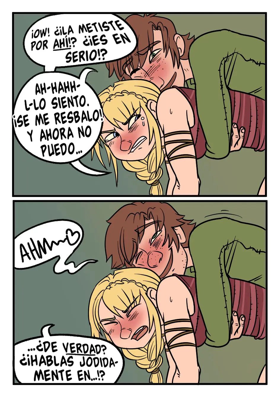 Ahora está probando otra posición, con él detrás. Pero Astrid le advierte que es mejor que no se corra dentro, lo cual ya es muy tarde. Hipo intenta sacarla, pero se le resbala y entra por el otro agujero. Quisiera sacarla también de allí, pero su trasero parece estar apretando realmente fuerte. Ni siquiera ella sabe como es que sigue duro, pero al parecer es algo que Hipo no puede controlar. Además, ha estado pensando en seguir haciéndolo, ya que por allí no habría riesgo de hacer un bebé.