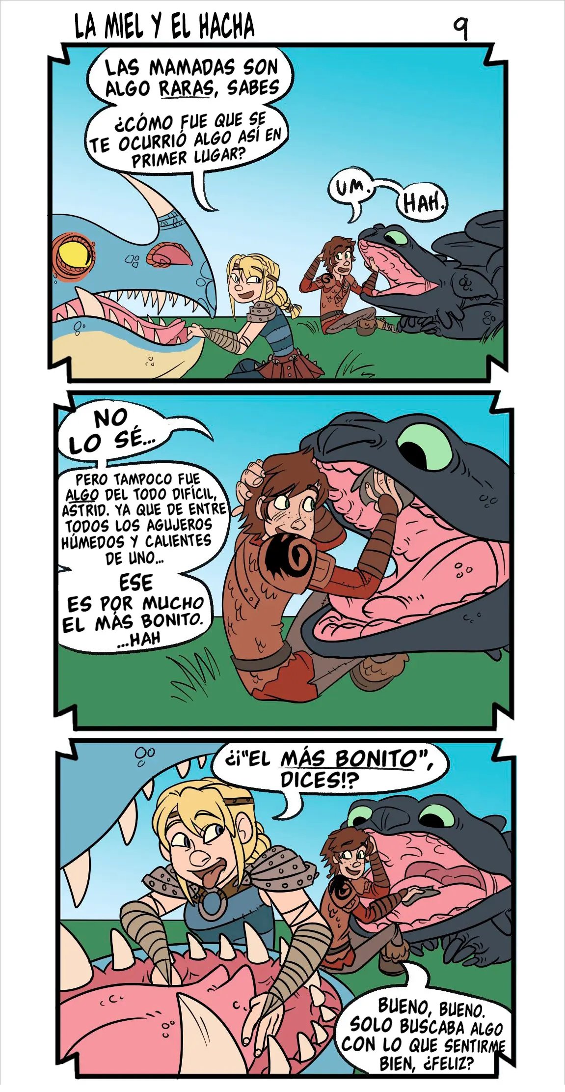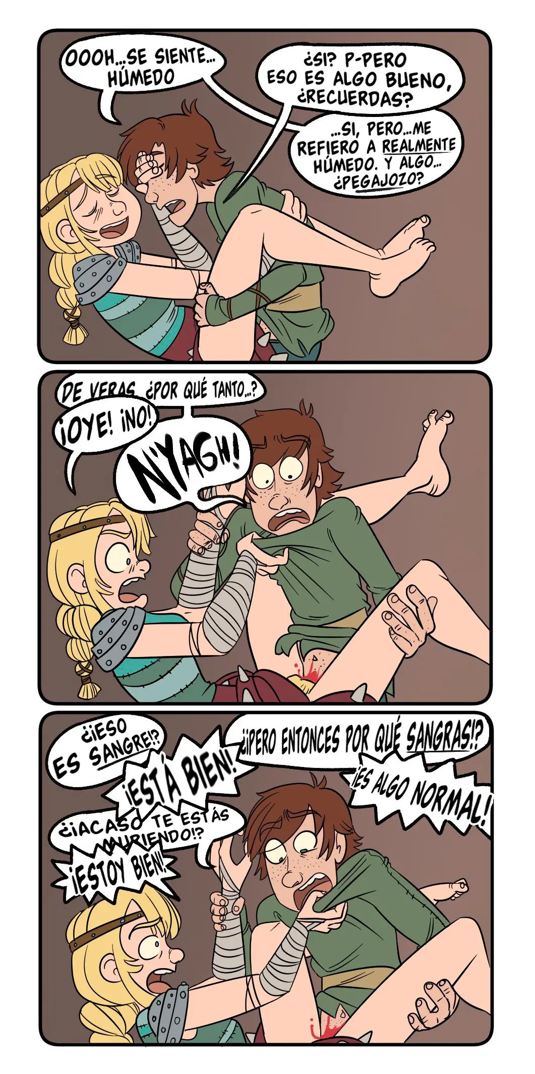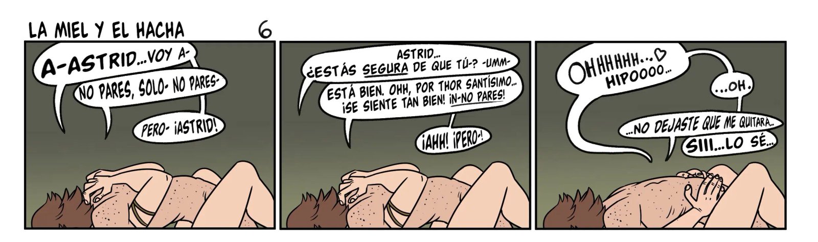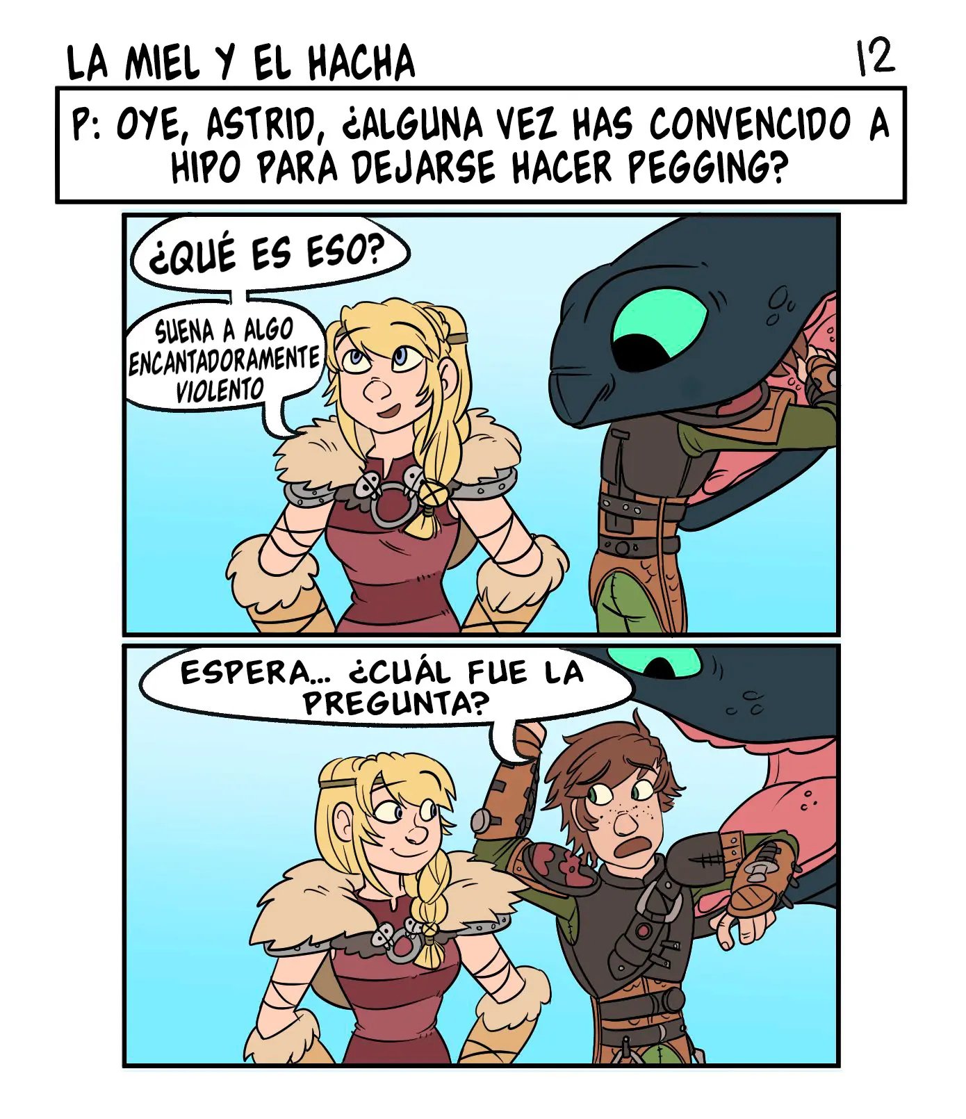 Astrid quiere contar algo avergonzó de Hipo cuando tuvieron sexo, y tiene que ver con que un dragón estaba con ellos cuando lo hacían. Hipo uso su saliva como lubricante. Lo cual es mejor que la vez que lo dejo solo e incendio la casa. Pero sus aventuras sexuales son muy variadas, con una vez que lo hicieron en las alturas, y la vez que el padre de Hipo casi los pillas mientras él le comía el chocho a la chica.