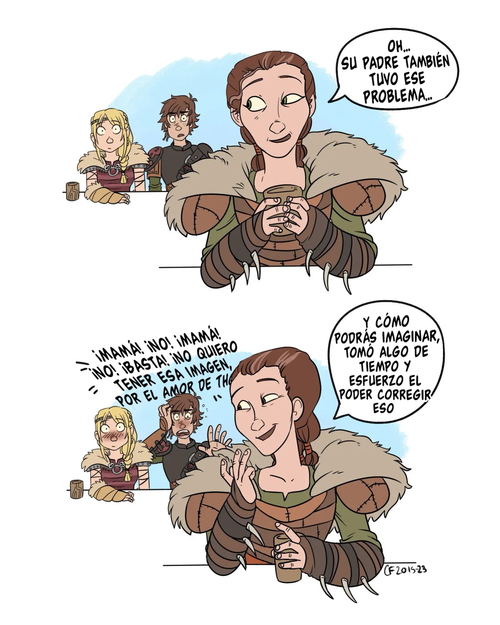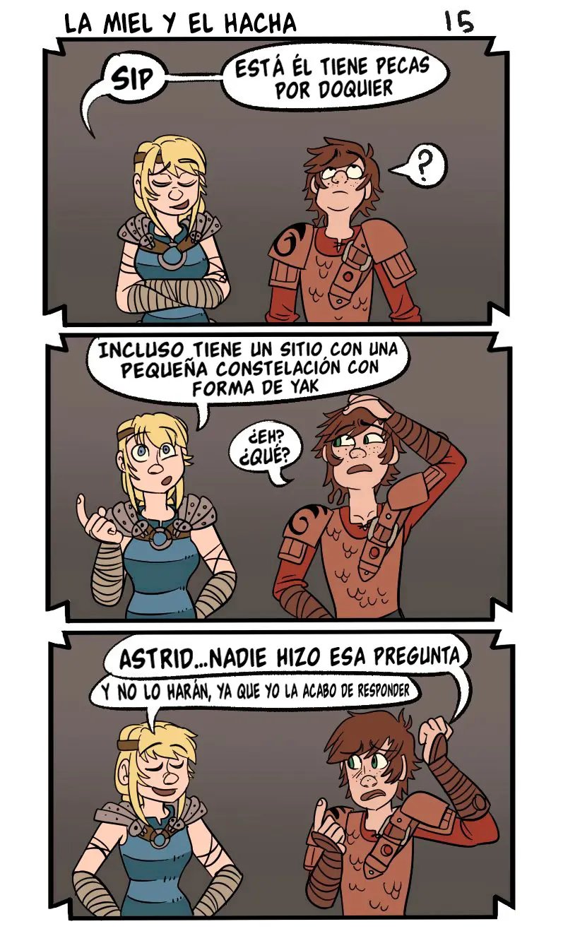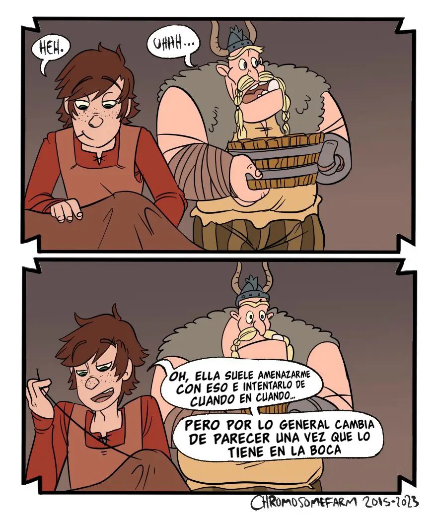 Y es mejor que no hagan ruido, porque la madre de Hipo podrá volver en cualquier momento. Aunque no deberían preocuparse por ella, solo ha regresado por algunas cosas y ya se marchara. Aunque a Valka le ha parecido muy dulce lo que hacen. Que no hace más que avergonzar al chico con todas las historias que tiene para contar de sus experiencias personales.