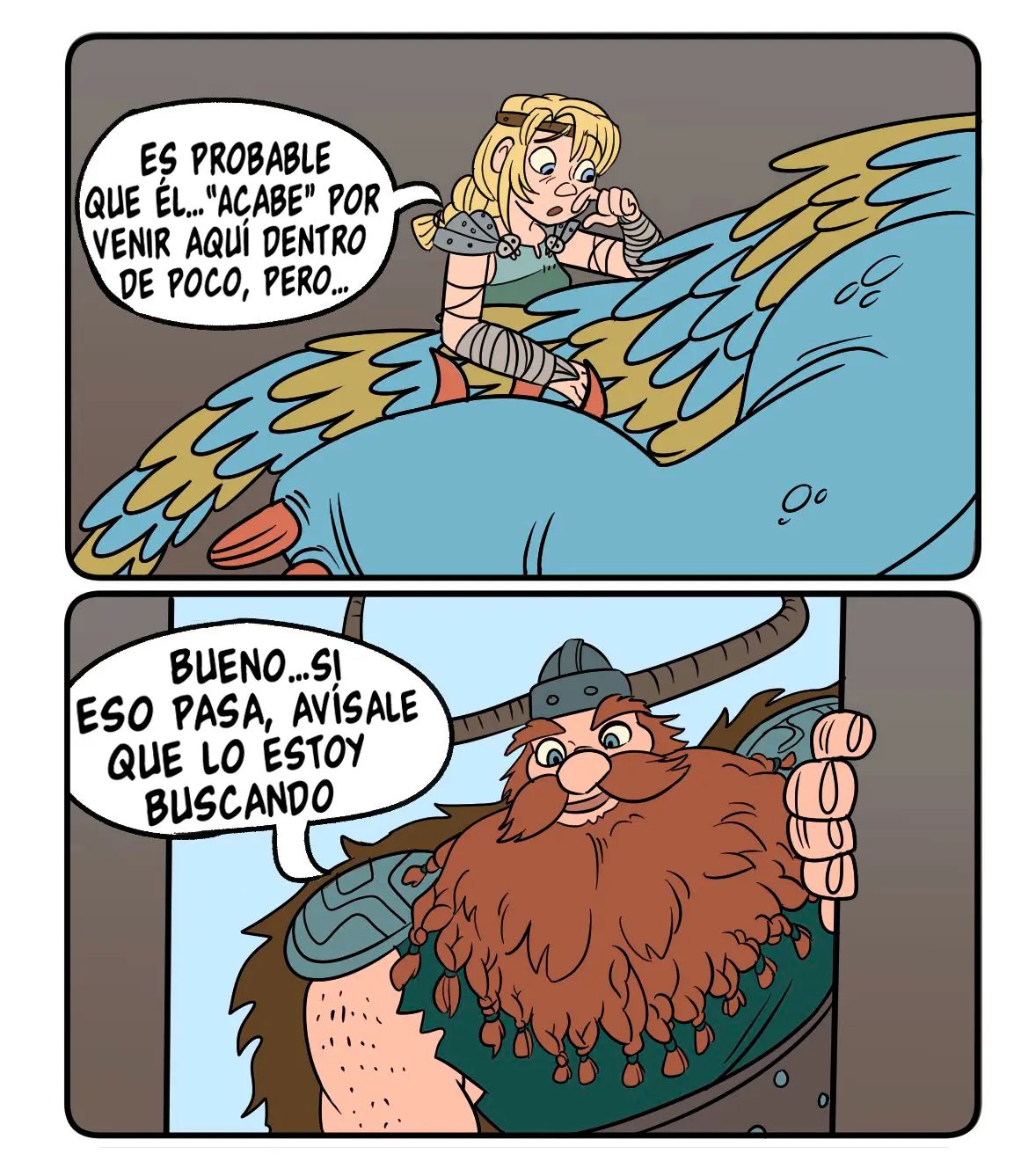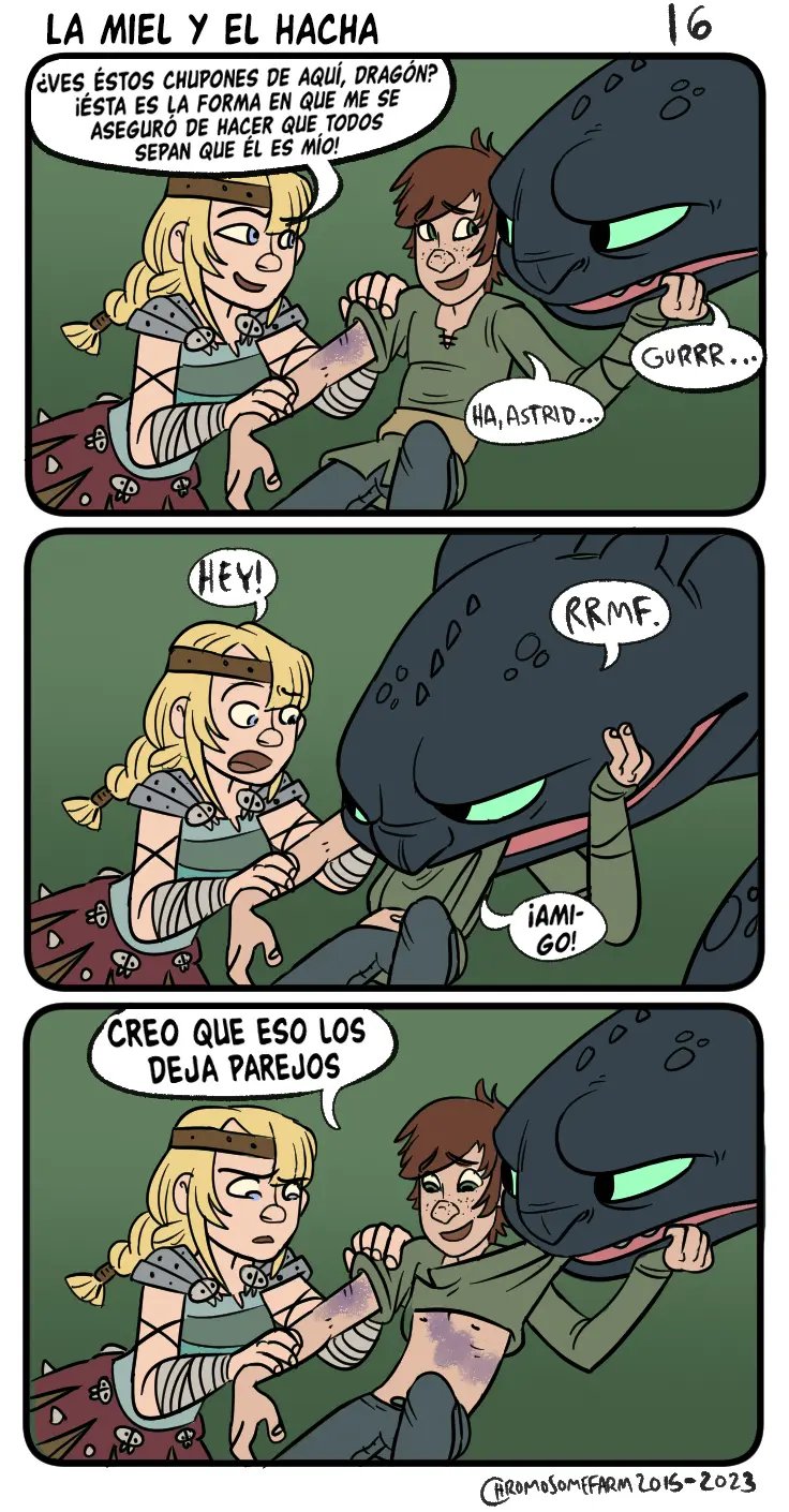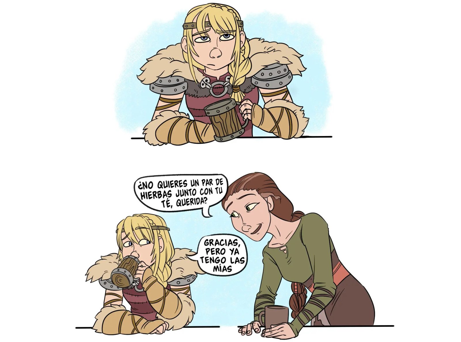 Y es mejor que no hagan ruido, porque la madre de Hipo podrá volver en cualquier momento. Aunque no deberían preocuparse por ella, solo ha regresado por algunas cosas y ya se marchara. Aunque a Valka le ha parecido muy dulce lo que hacen. Que no hace más que avergonzar al chico con todas las historias que tiene para contar de sus experiencias personales.