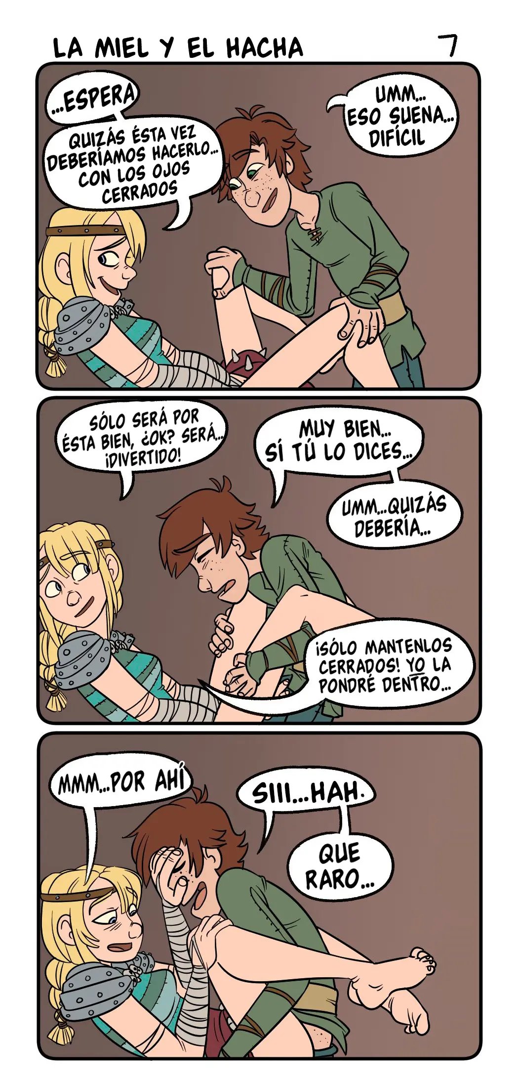 En otra ocasión Astrid le propone hacerlo con los ojos cerrados, lo cual suena difícil. Pero como es divertido, Hipo decide probarlo. Él solo tiene que mantener los ojos cerrados, y ella se encargara de ponerla dentro. Hasta que comienza a sentir que ella está muy humedad, que no es tan bueno como pensaban. Al menos eso quiere decir que no está embarazada. Lo raro es que en esos días ella se pone cachonda, y ella está dispuesta a seguir si él quiere. Y si son vikingos, algo como esto no debería incomodarlos.