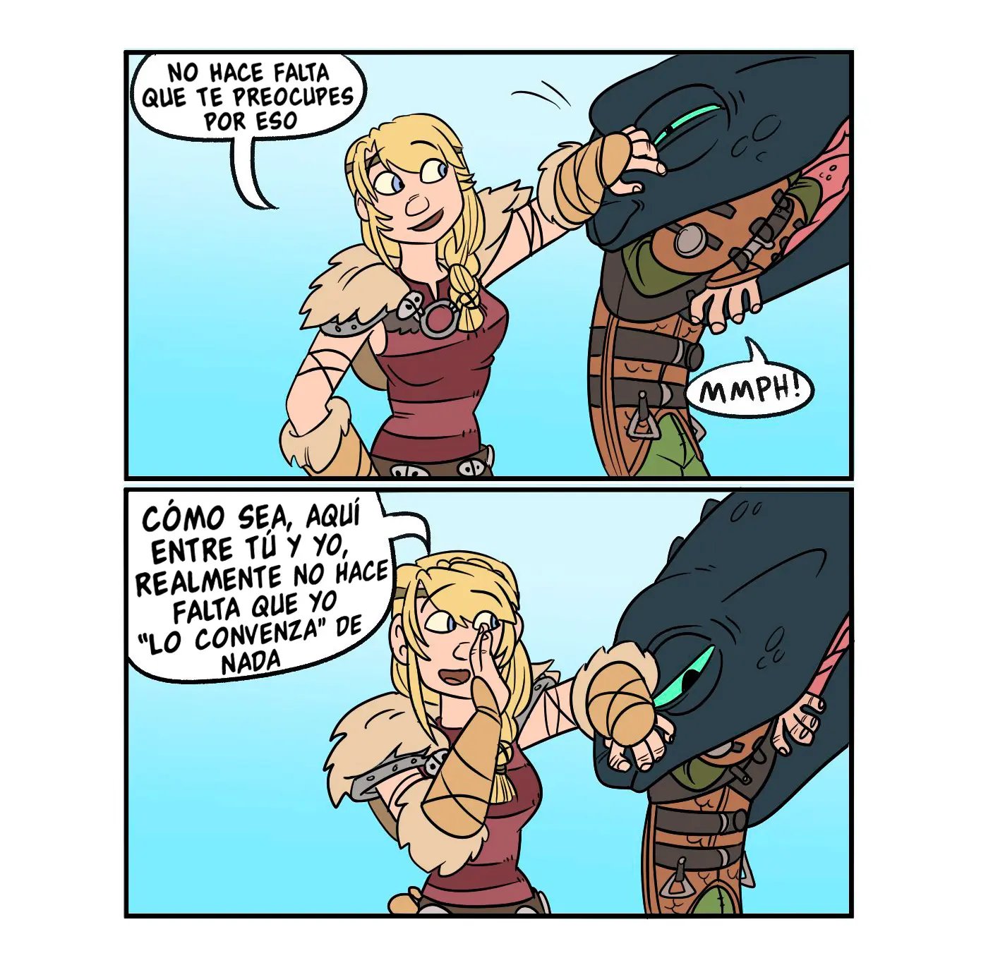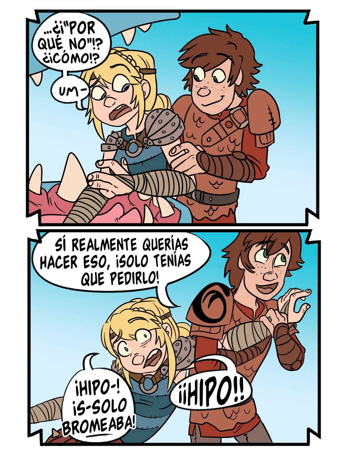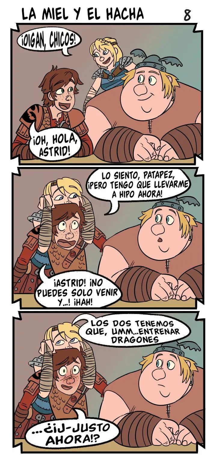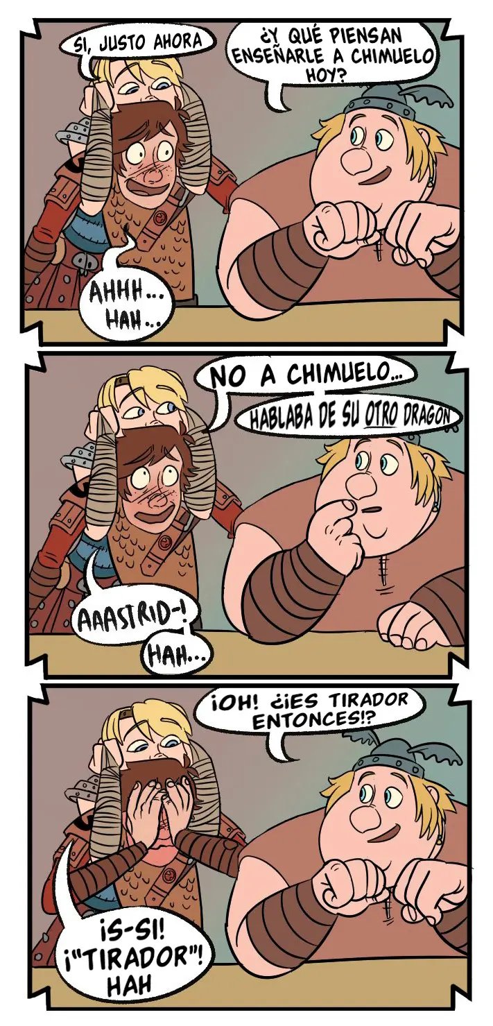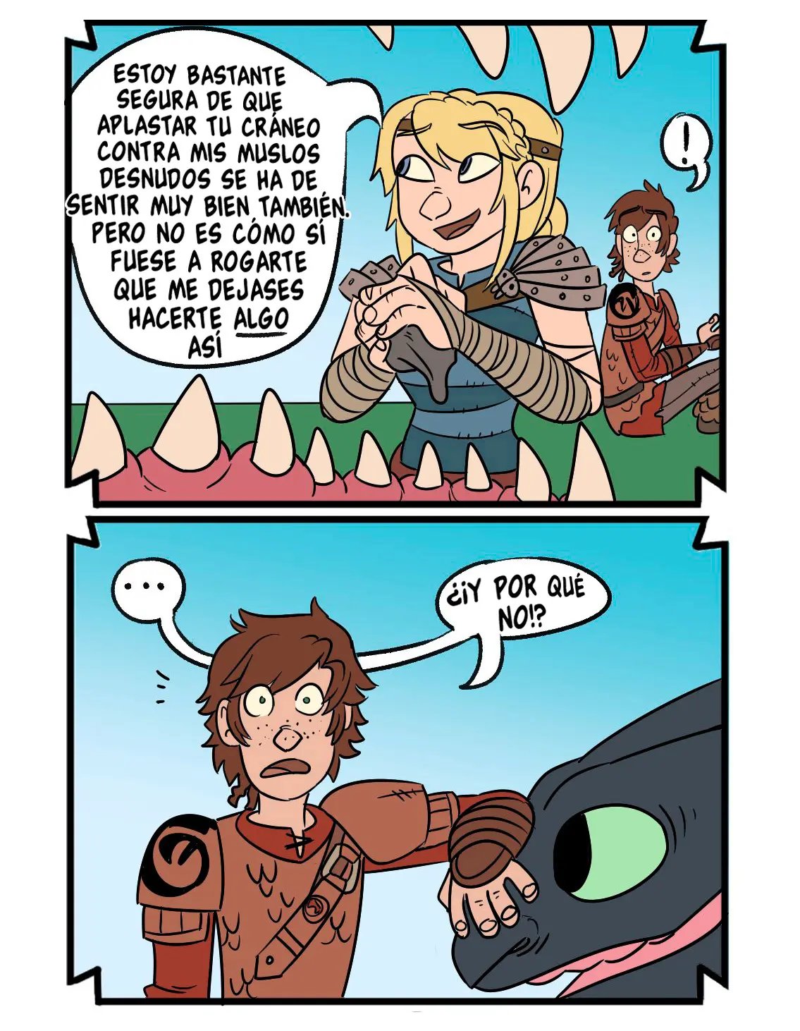 Hipo estaba hablando con sus amigos, pero Astrid tiene que llevárselo. La excusa es entrenar dragones, pero en realidad tiene planeado otra cosa para él. Ella dice que quizás se ha de sentir muy bien aplastar la cabeza de Hipo con sus muslos desnudos, que es una idea que al chico le gusta mucho y quisiera probarla. Lástima que casi lo hace morir, aunque a ella le ha puesto muy caliente.