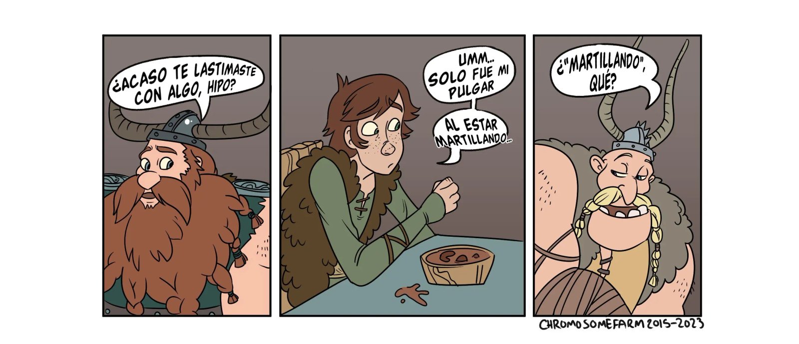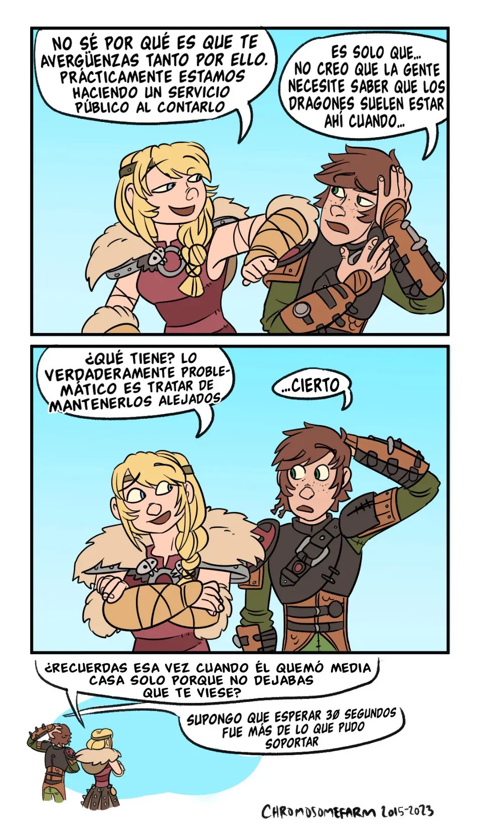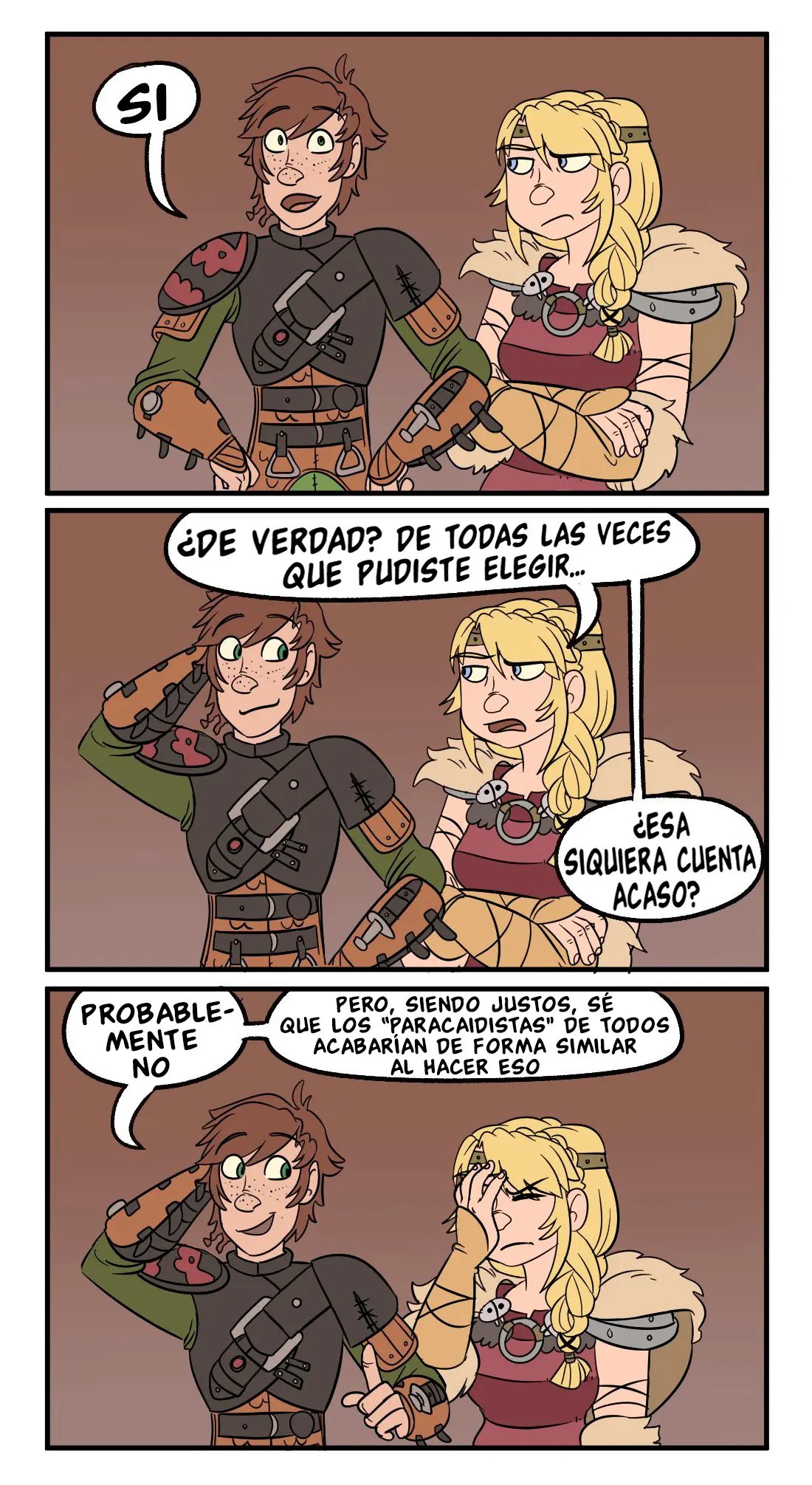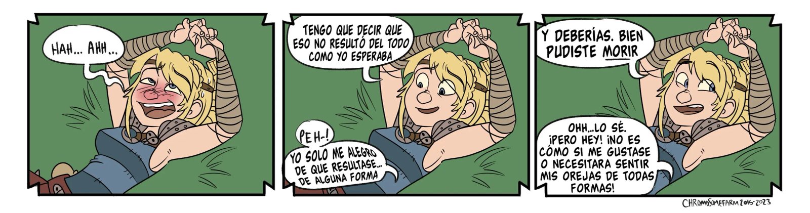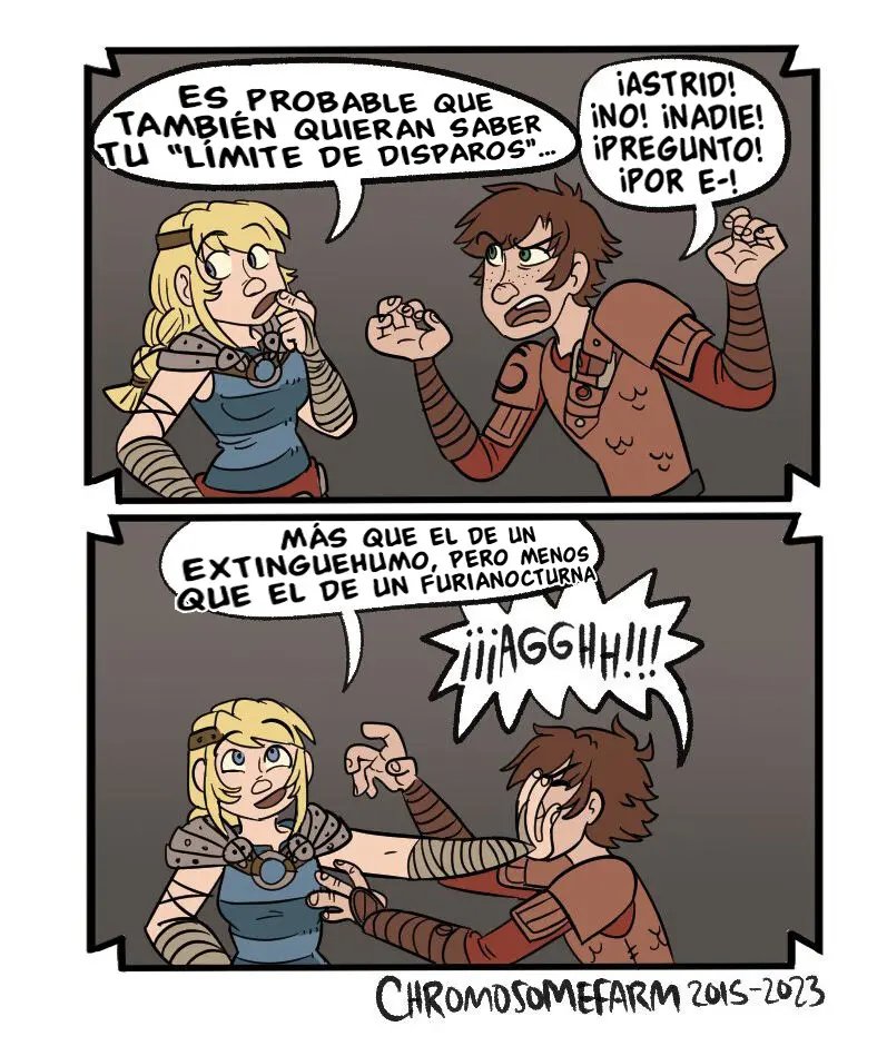 Hipo estaba hablando con sus amigos, pero Astrid tiene que llevárselo. La excusa es entrenar dragones, pero en realidad tiene planeado otra cosa para él. Ella dice que quizás se ha de sentir muy bien aplastar la cabeza de Hipo con sus muslos desnudos, que es una idea que al chico le gusta mucho y quisiera probarla. Lástima que casi lo hace morir, aunque a ella le ha puesto muy caliente.