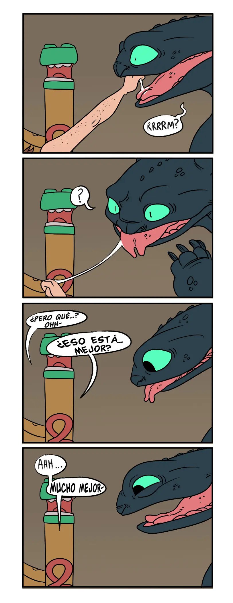 Astrid ahora está desnuda y toda pegoteada, todo su semen está por todos lados. Pero al menos ha logrado sacarla antes de que le haga un creampie a Astrid. Quien es lamida por Chimuelo, que encuentra útil hacerlo. Y eso que Hipo tiene más para ella.