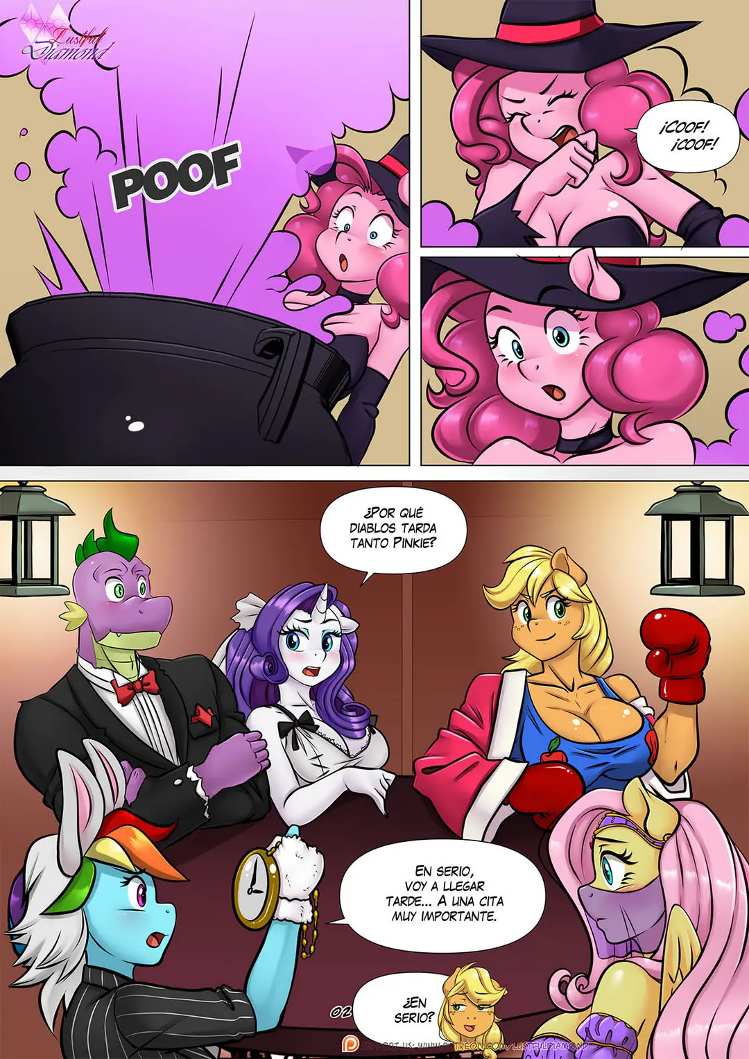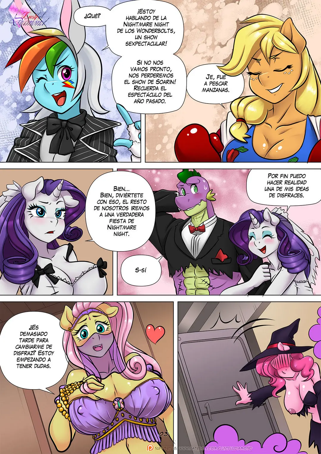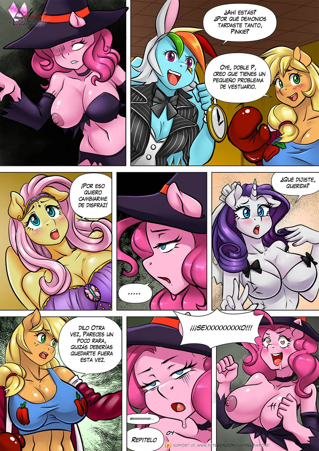 Es Noche de Brujas y las ponis se han disfrazado y juntado a cenar en la casa de Pinkie, Pinkie es la encargada de cocinar. Y se ha puesto un disfraz muy super sexy de bruja.