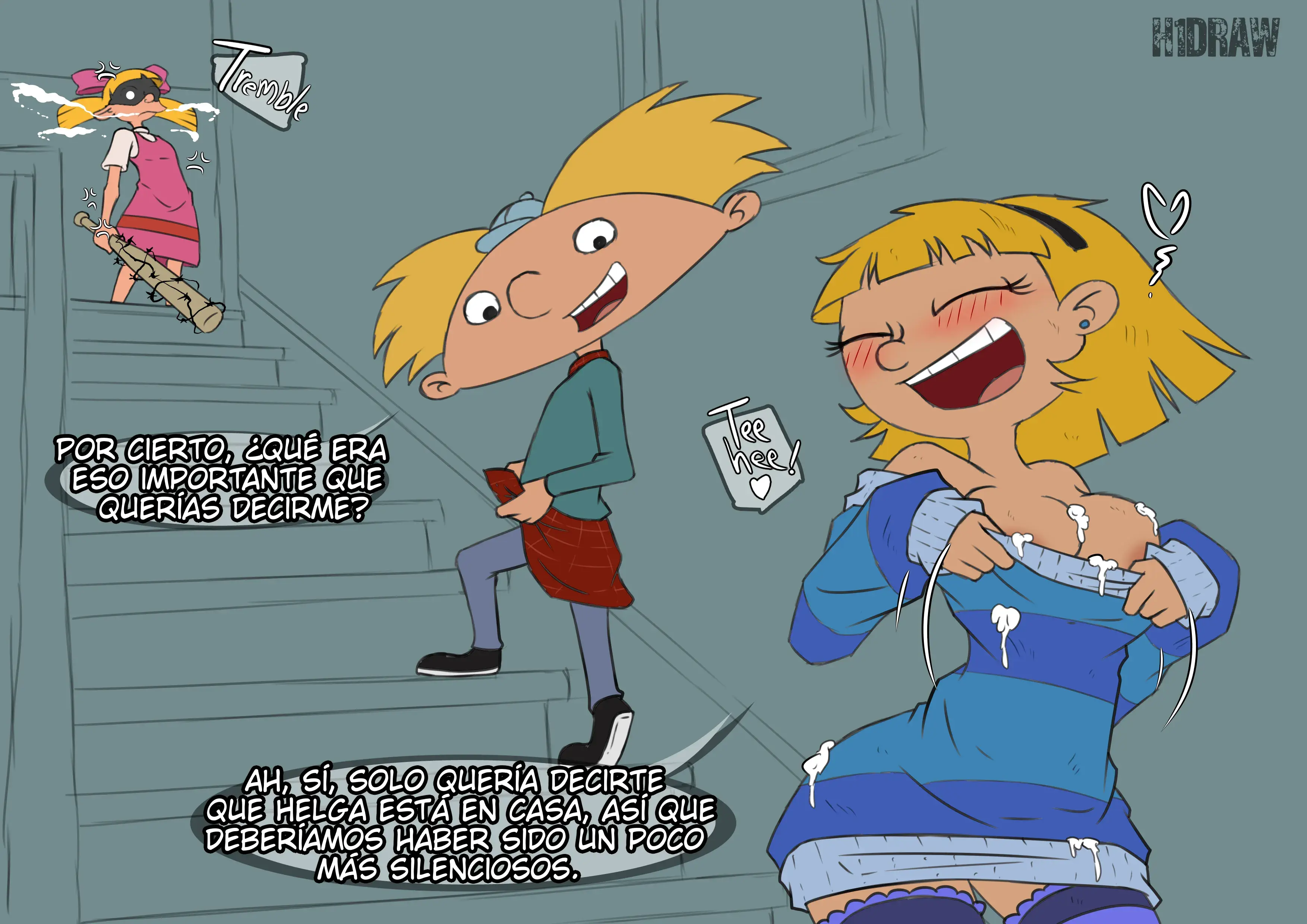 Una vez que han terminado y ella se vuelve a levantar su suéter, ahora todo lleno de semen, Arnold pregunta qué es lo que quería decirle antes. Era para avisarle que Helga estaba en la cara y que deberían ser silenciosos. Lo cual es un poco tarde ahora, porque ella lo está esperando con un bate en la cima de la escalera.
