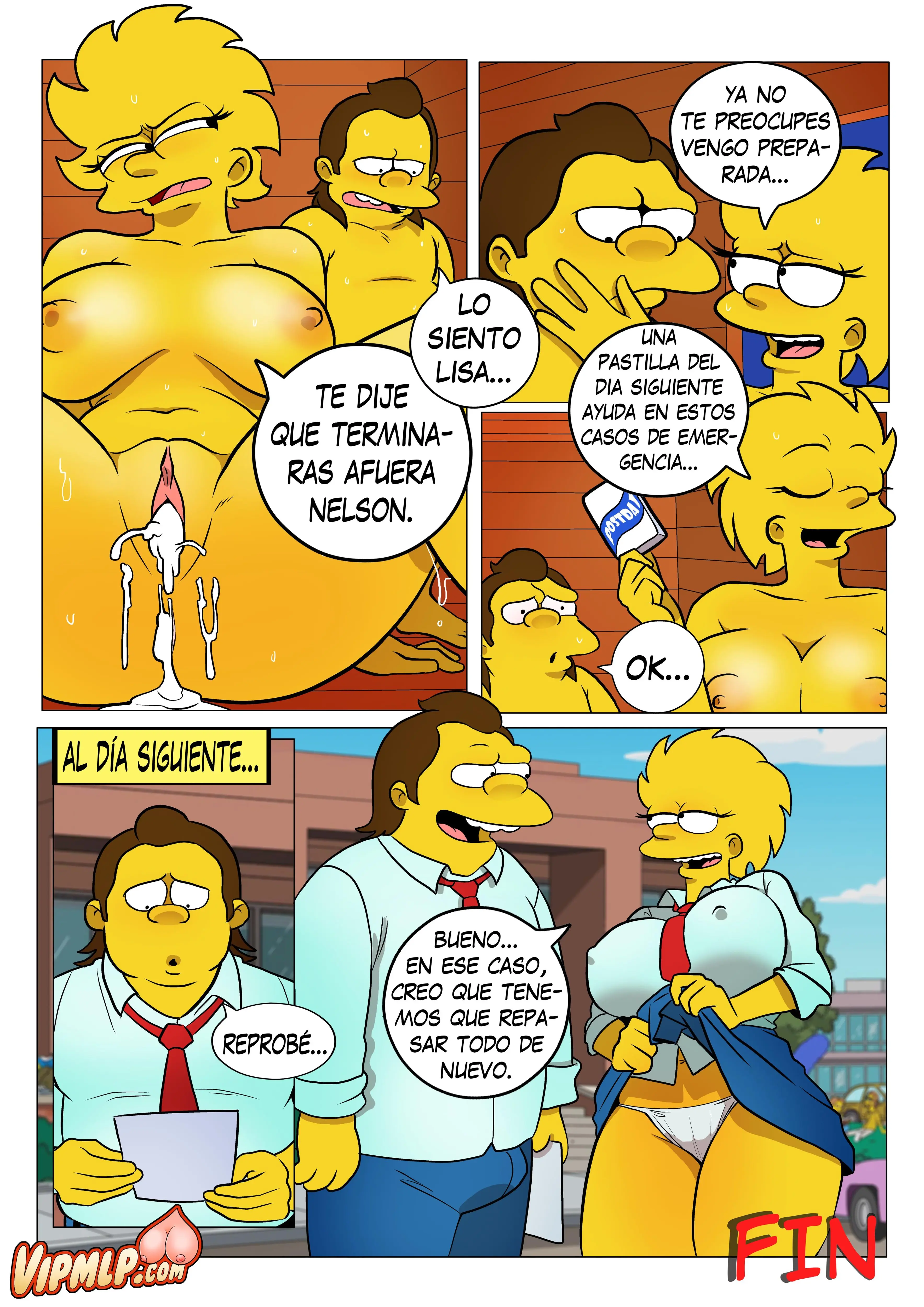 Eso lleva a que Nelson se ponga bien duro. Y así continúa Lisa con su enseñanza, diciendo que los pezones son una de las principales zonas erógenas de la mujer, por eso debe aprender a estimularlos. Pero hay una parte con más terminaciones erógenas; la vagina. Y Lisa vuelve a ordenar que se la coma. Lo cual Nelson hace muy bien, ya que tiene práctica pegando estampillas en el correo. Se podría decir que es todo un experto, ya que lleva a Lisa rápidamente al orgasmo. Luego, Nelson tiene curiosidad de cómo sabe el pequeño hoyito, y mete su lengua dentro de él para poder saberlo. Eso la toma por sorpresa a Lisa, pero sí que lo disfruto. Luego, Nelson tiene intriga por saber qué tan profundo puede llegar su dedo en el hoyo, lo cual le deja doliendo el trasero a Lisa. Lisa le explica que esa zona necesita más preparación y que lo dejarán para otra ocasión.