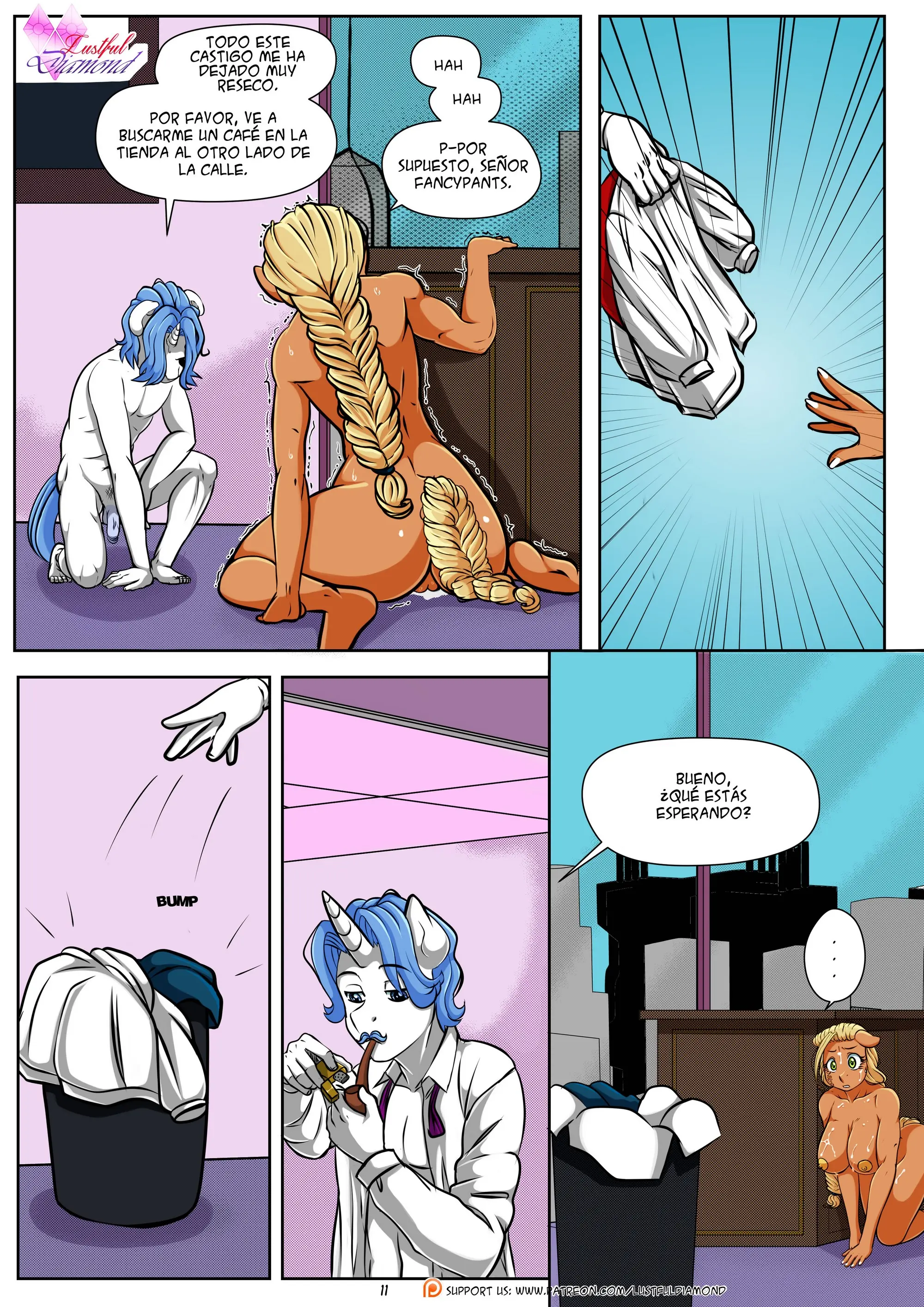 Applejack sigue sus estrictas órdenes, poniendo de rodillas a sus pies y metiendo esta polla en la boca como le ha ordenado, mientras él empuja su cabeza para que le entre más profundo en la boca. El jefe está por terminar y le ordena que corra la boca, ya que no merece tener su semilla dentro de ella, por lo sucia que es. Luego de sacarla, le termina en el rostro y los pechos.