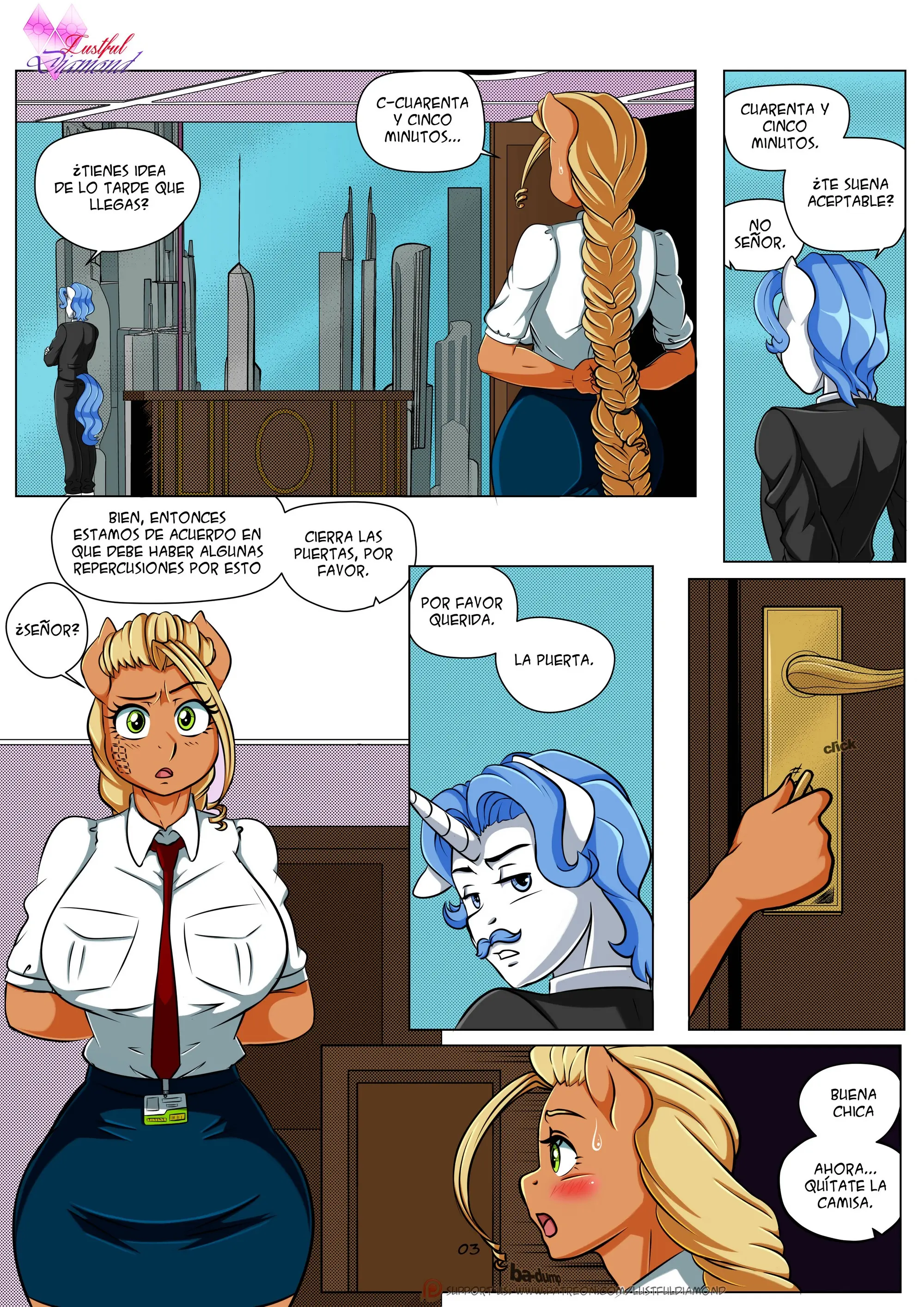 Applejack entra a la oficina asustada y sudando. El jefe la está esperando con un gran rostro de enojo, diciéndole que no es aceptable para ninguno de sus empleados llegar 45 minutos tarde; luego le pide que cierre la puerta. Y que se quite la camisa y el sostén.