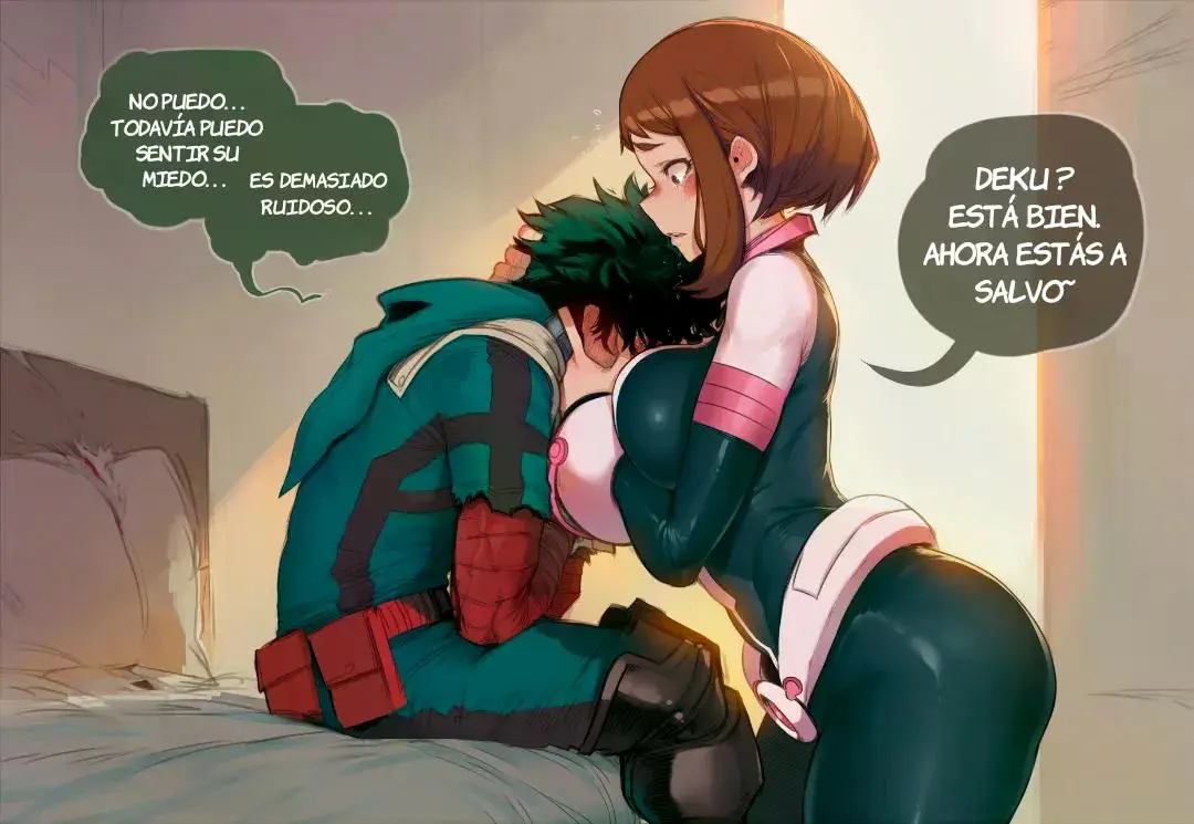 Ochako intenta tranquilizar a Deku, poniendo sus pechos en la cara de este héroe. Aunque él no debería preocuparse más, ella está para consolarlo y se ha subido encima para ayudarlo a trabajar con su respiración. La cual se acelera una vez que Uraraka toma su mano y la pone sobre su pecho para que la sienta.