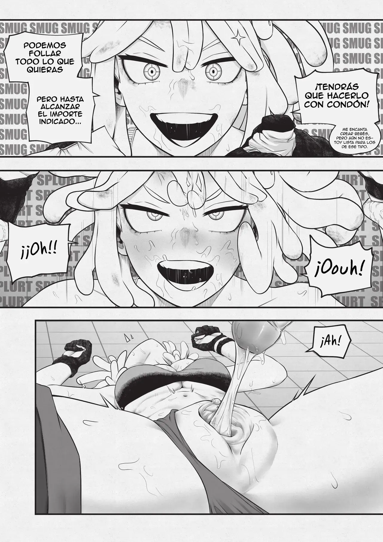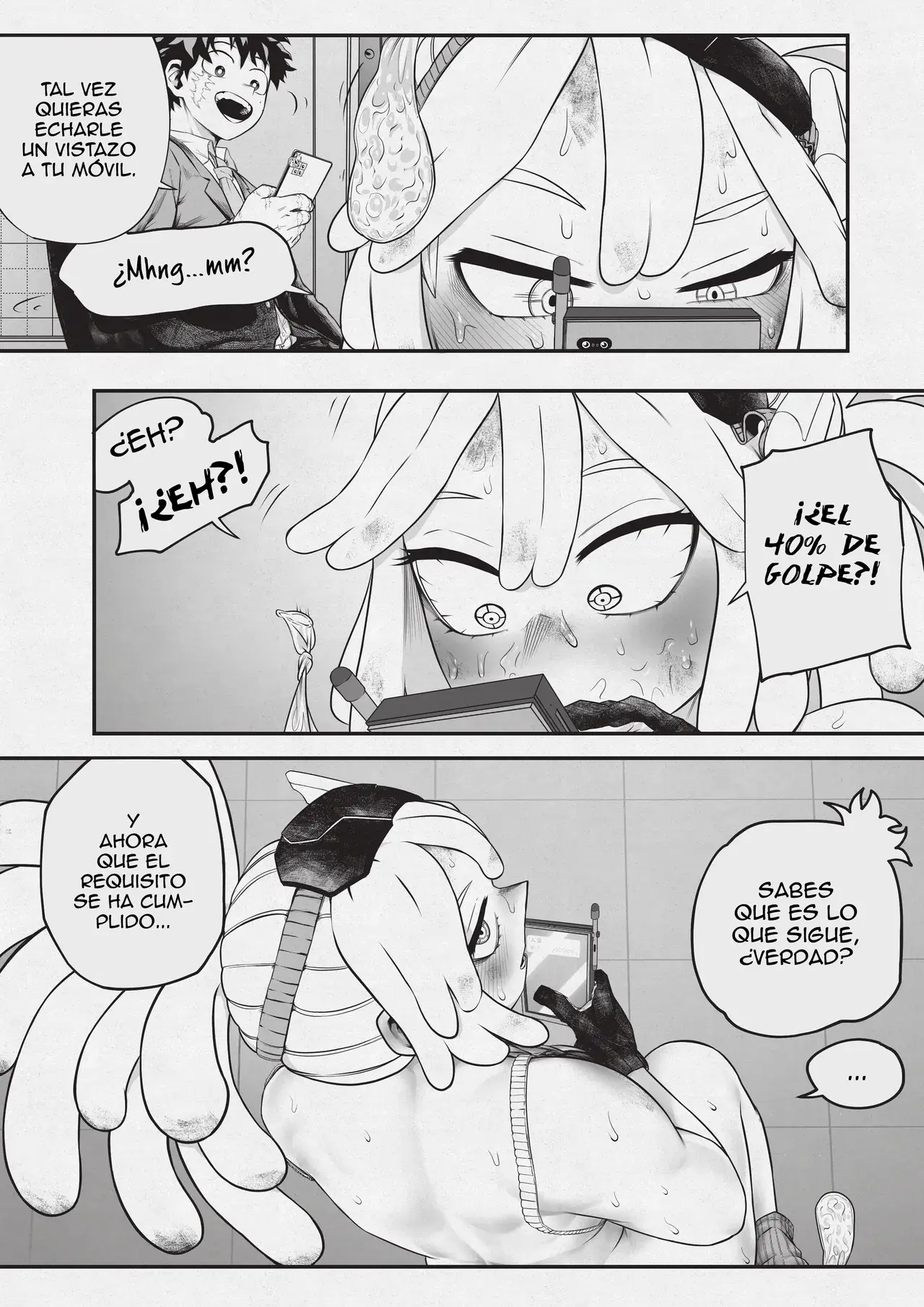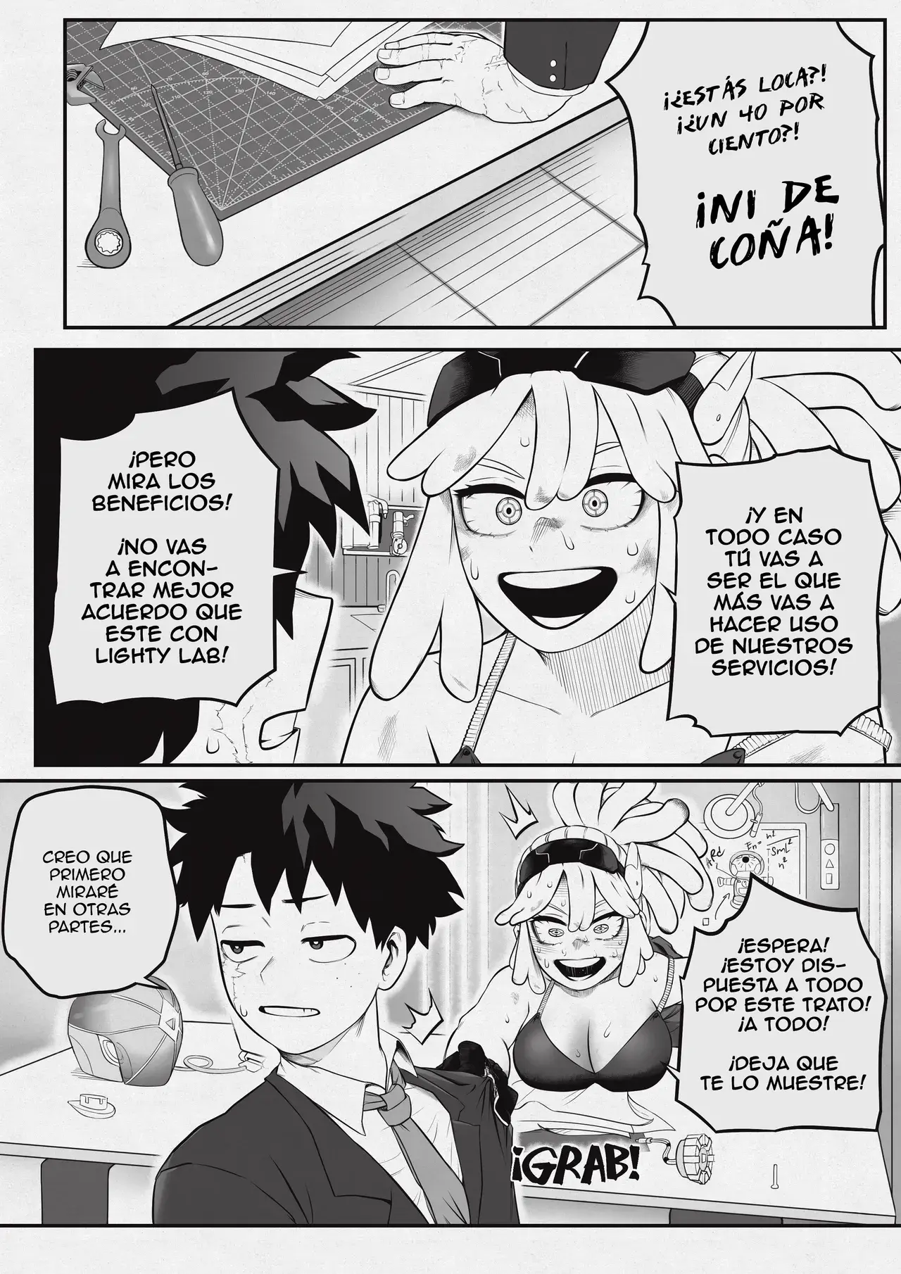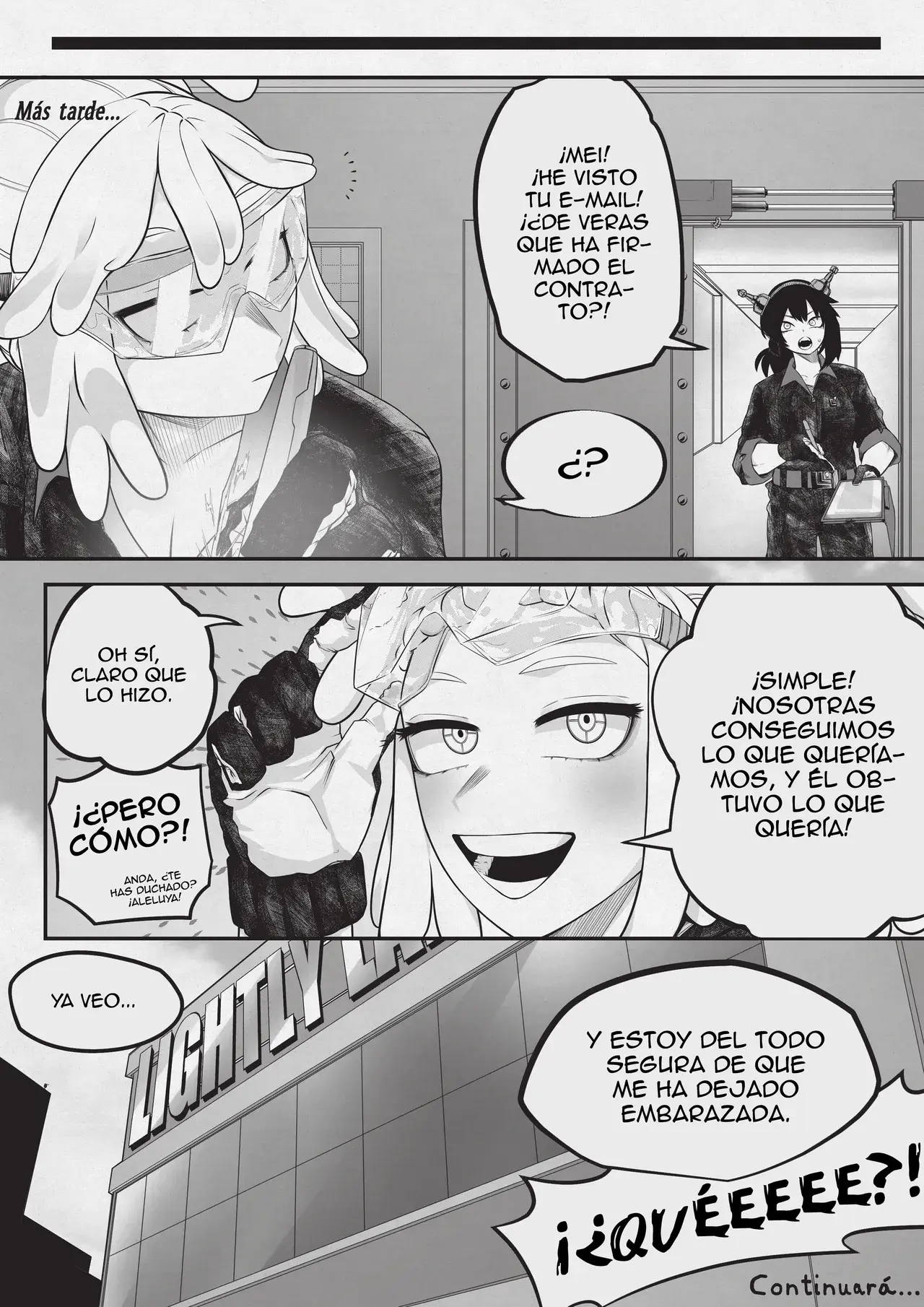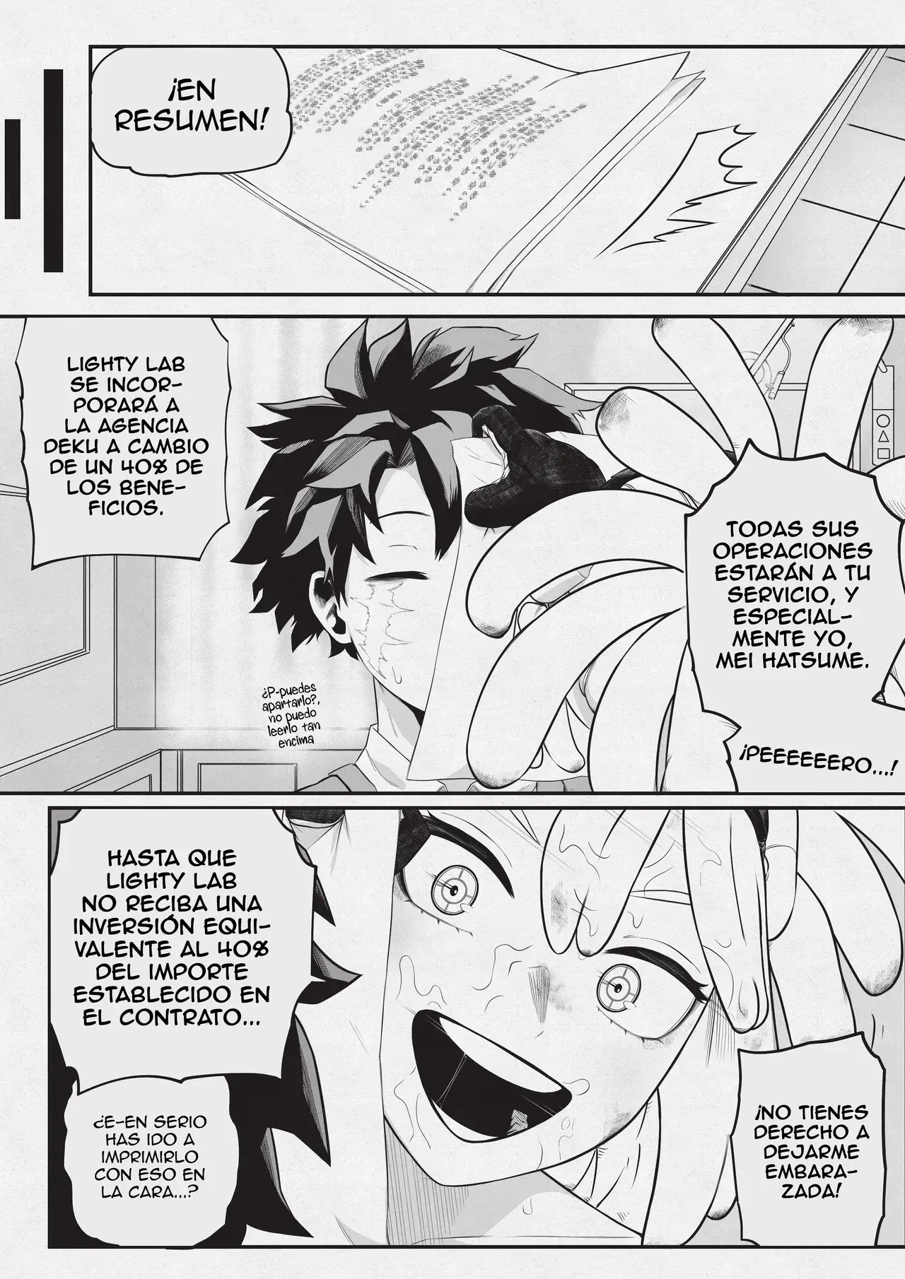Mei Hatsume ha ido con semen en la cara a imprimirlo, pero ha traído la versión final del contrato. Donde no puede embarazarla hasta pagar el 40%, pero sí podrán follar todo lo que quieran a cambio de que su Laboratorio se incorporara a la agencia de Deku. Eso significa que tendrá que hacerlo con condón.