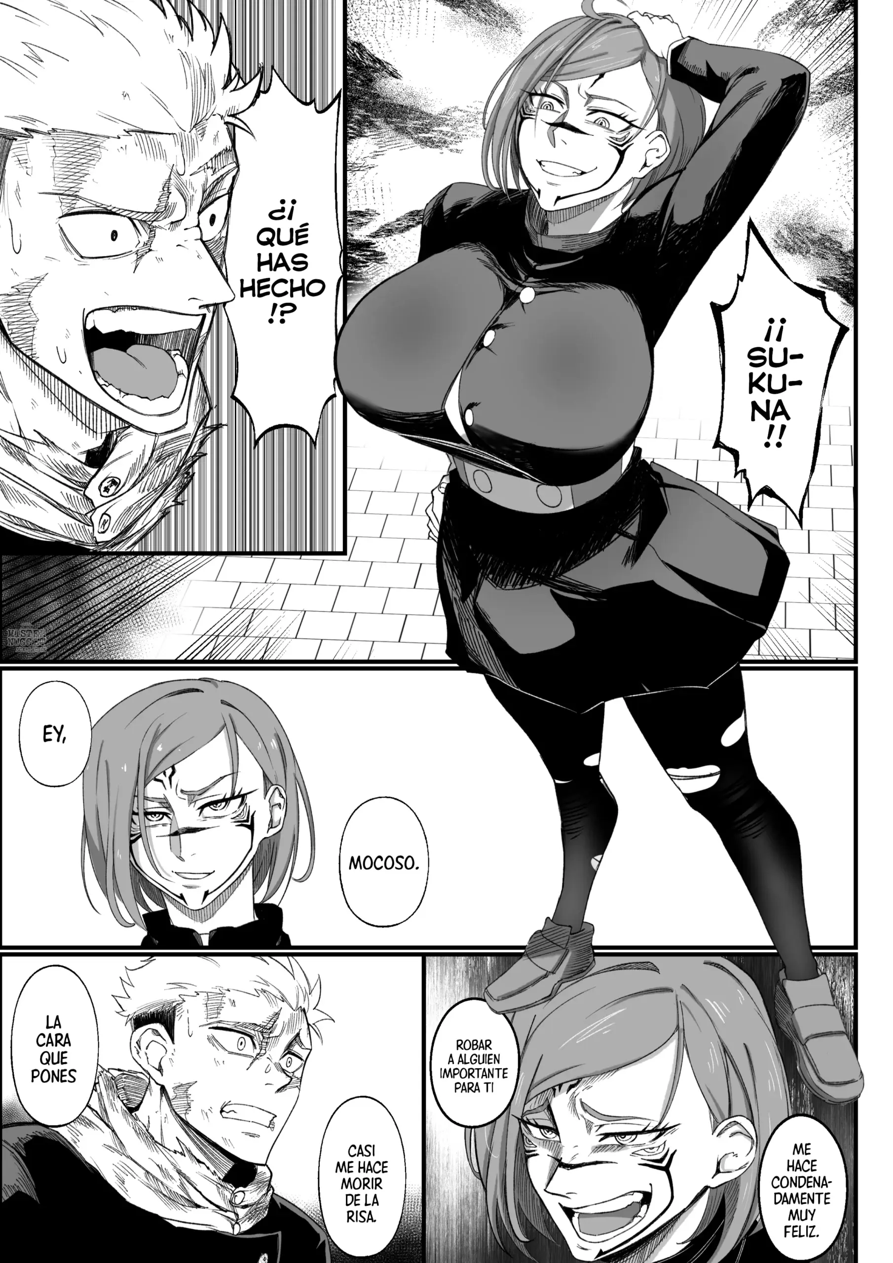 Sukuna ha querido vengarse de Itadori al poseer el candente cuerpo de Nobara. Al que no sabemos si le han crecido las tetas gracias al poder de este demonio, o ella ya era así. El enemigo de Yuji está feliz de haber robado a alguien que le importe mucho al chico, lo hace condenadamente feliz. Con solo ver su cara le hace morir de la risa.