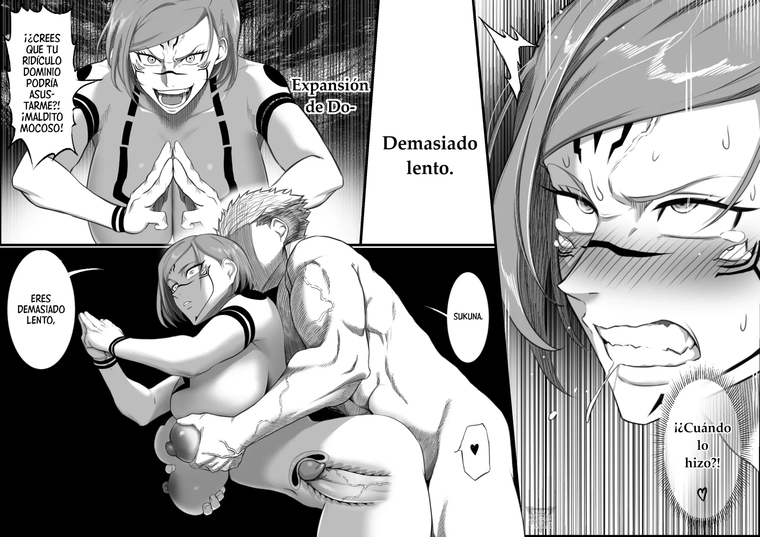 Itadori lo calla y luego le pregunta que va a hacer. A lo que Sukuna le responde que usara ese cuerpo para destruir todo lo que ama. El chico contraataca, para que no piense que si usa el cuerpo de su amiga, él no atacaría. Por eso hace una expansión de su dominio. El cual consiste en encerrarla y desnudarla completamente. Un dominio que no expira hasta que el oponente no sea golpeado por 24 horas o quede fuera de combate. Y no hablamos de golpes de puños, sino de pollas.