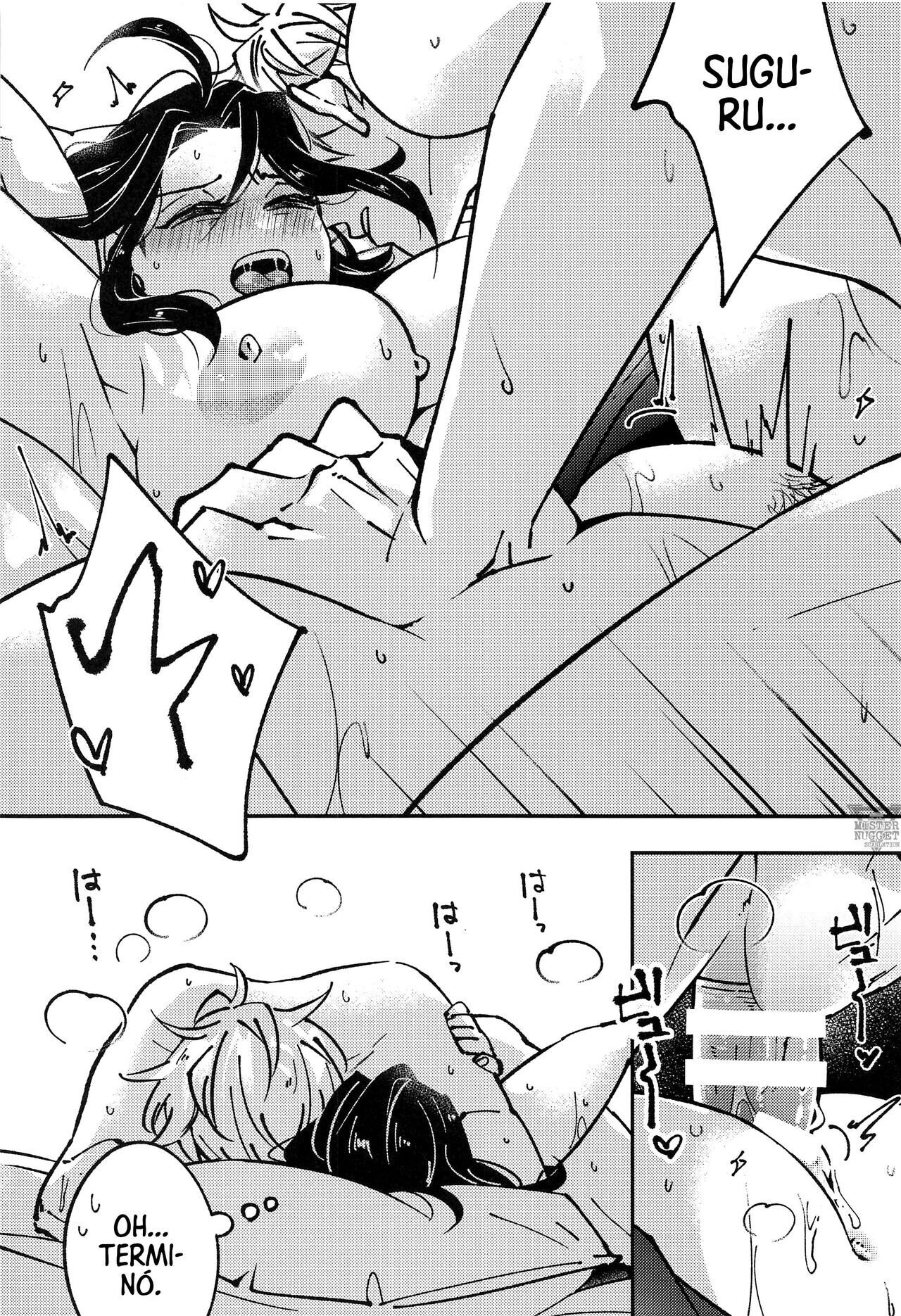 Así es como llegaron a donde están ahora. En donde Gojo está enojado porque no le gusta que se burlen de él por no haber estado nunca con una mujer. Por eso Geto le ofrece terminar con esto, frotando su verga para ofrecerle una corrida. Y la respuesta es una beso en la boca que deja claro lo que sucederá.
