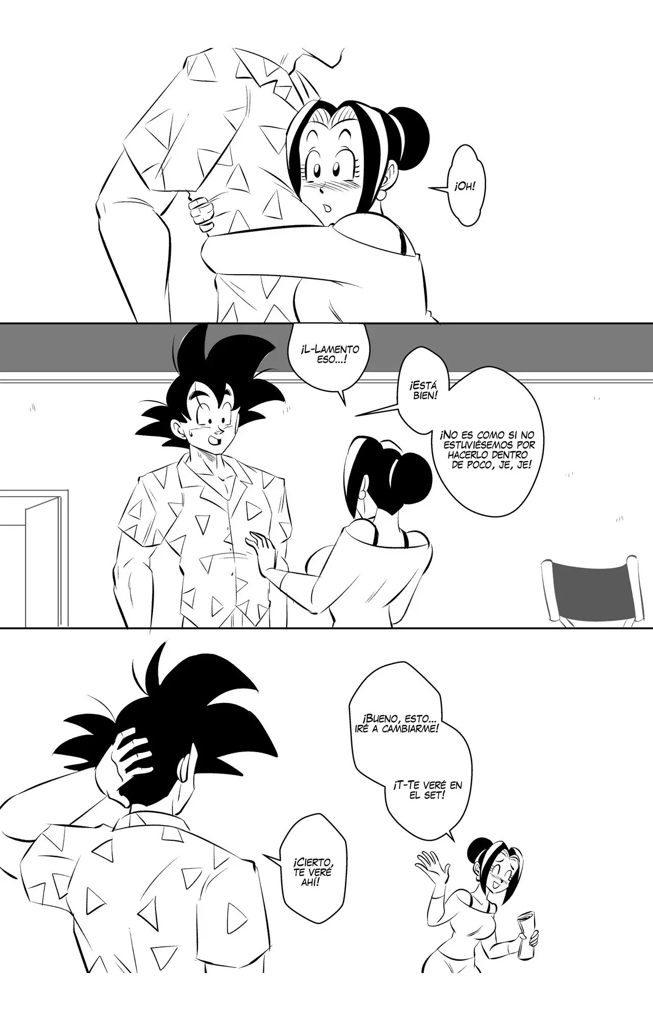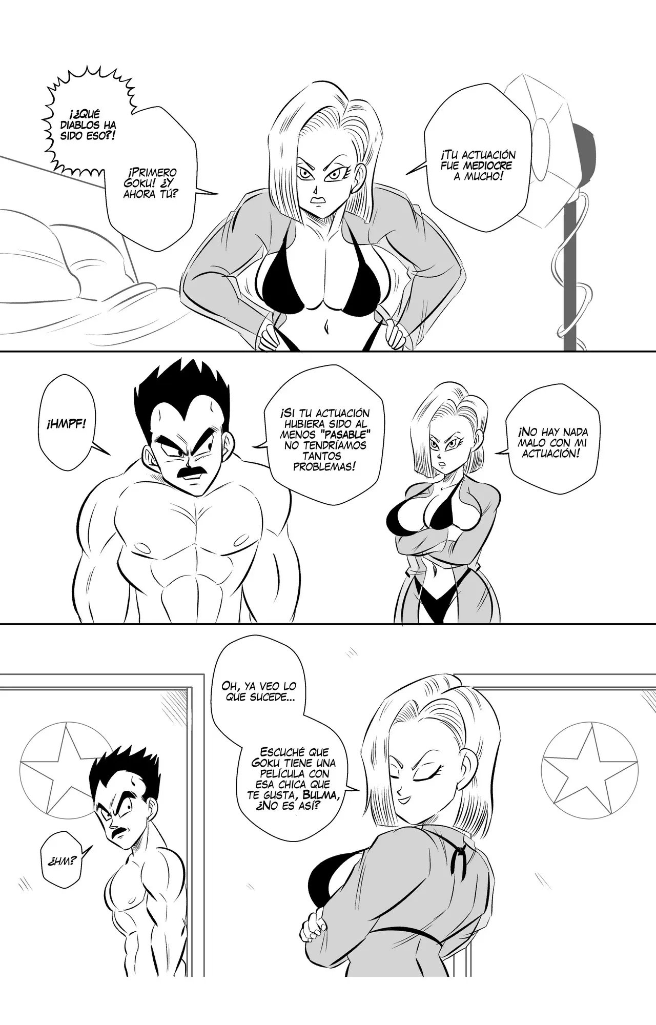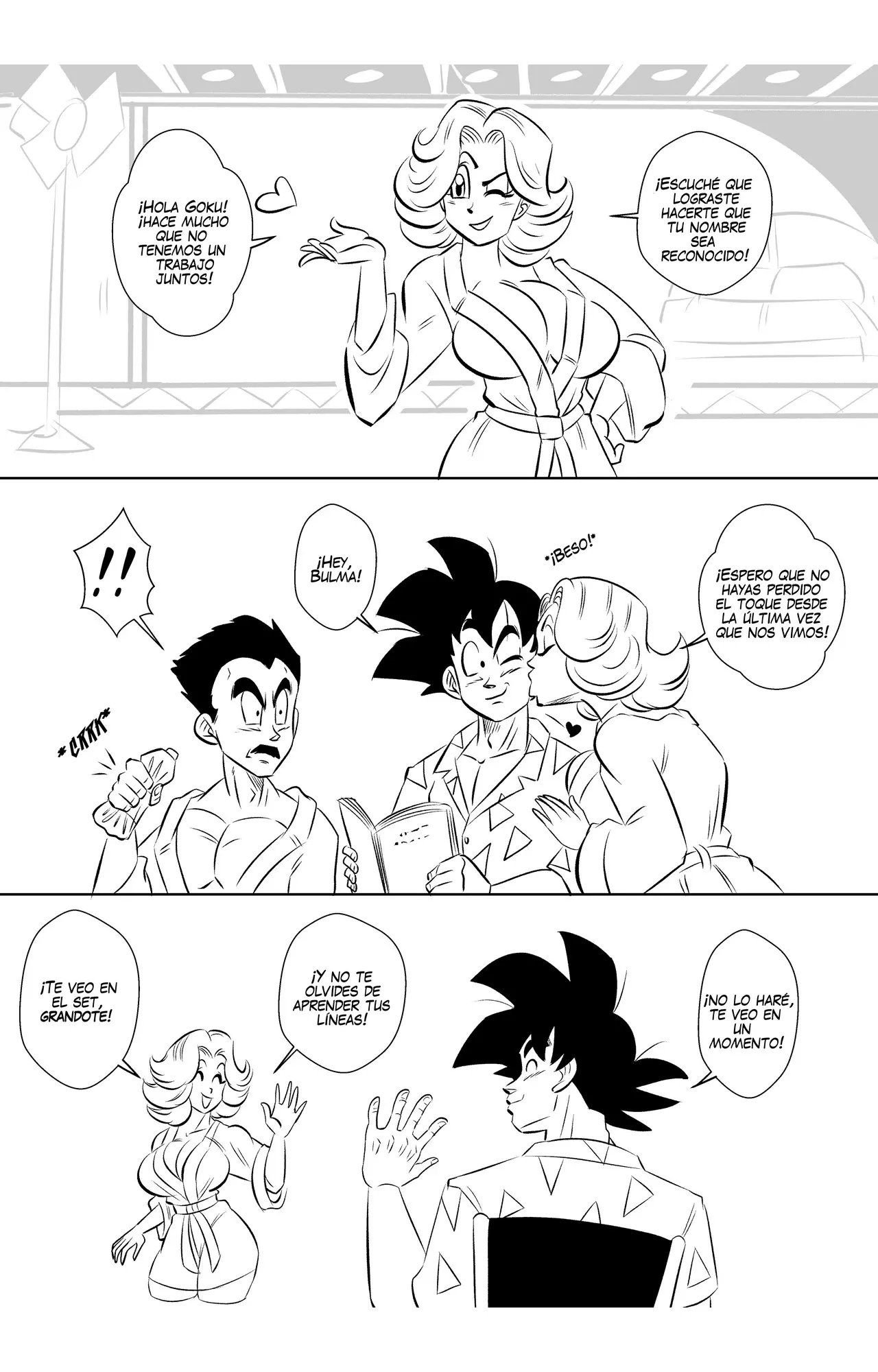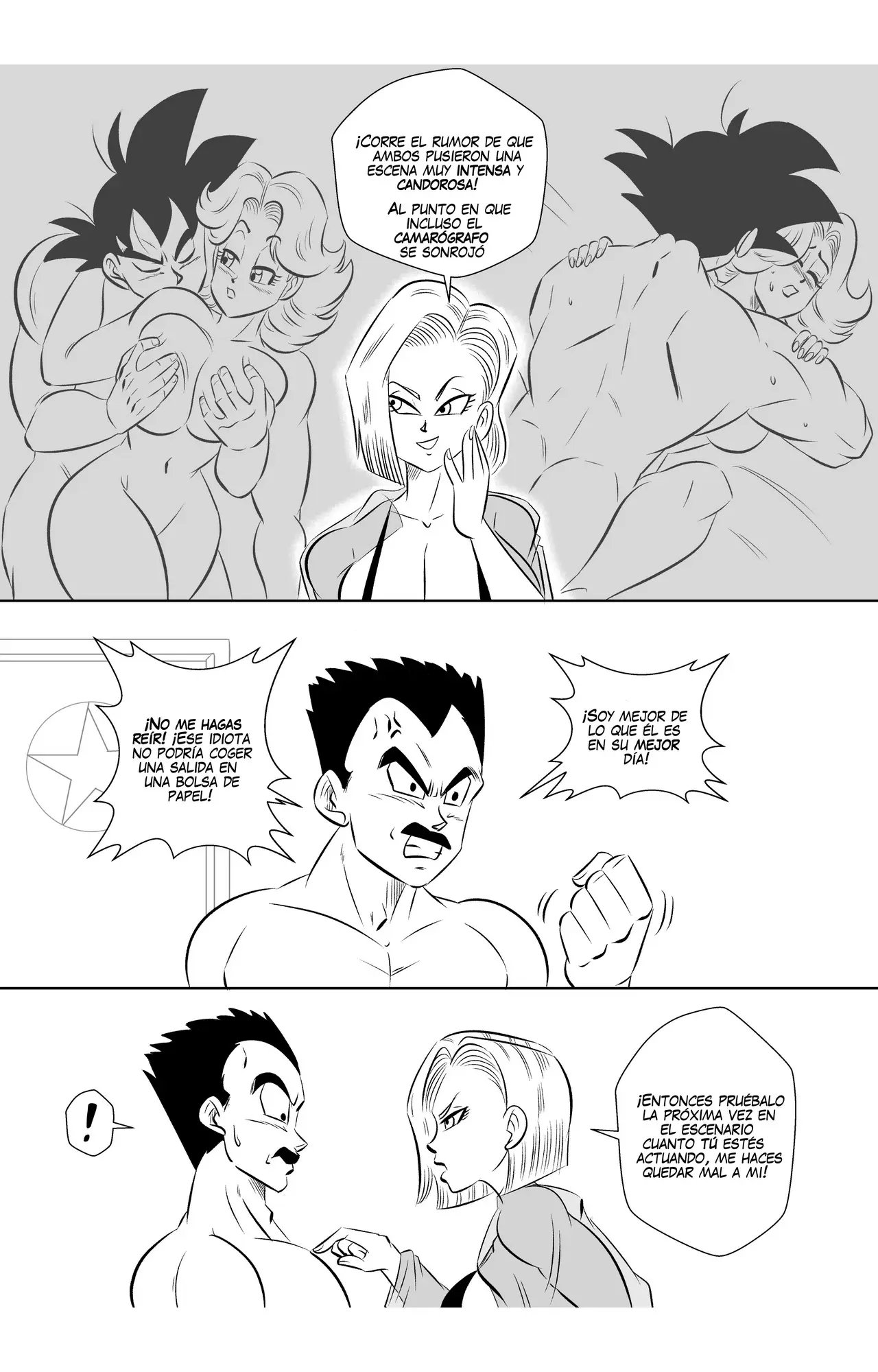 Goku y Vegeta hablaban sobre lo poco profesional que es Goku, hasta que llega Bulma y se alegra de que pueda volver a grabar otra escena con su mejor amigo. A quien le da un beso en la mejilla y le dice que espera que no haya perdido su toque. Eso enoja a Vegeta, que le dice que no se quedara esperando mientras ellos dos hacen una escena de sexo.