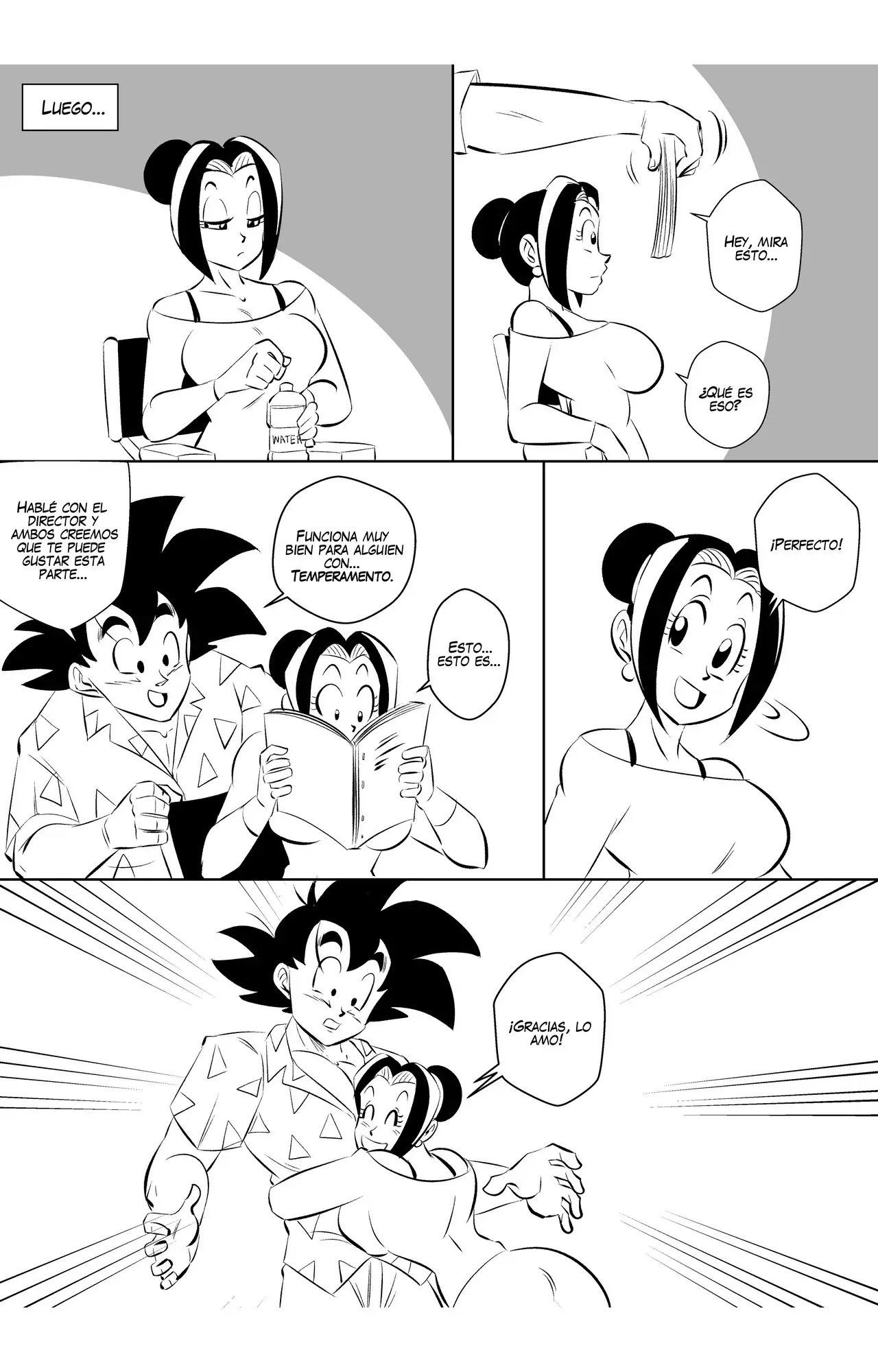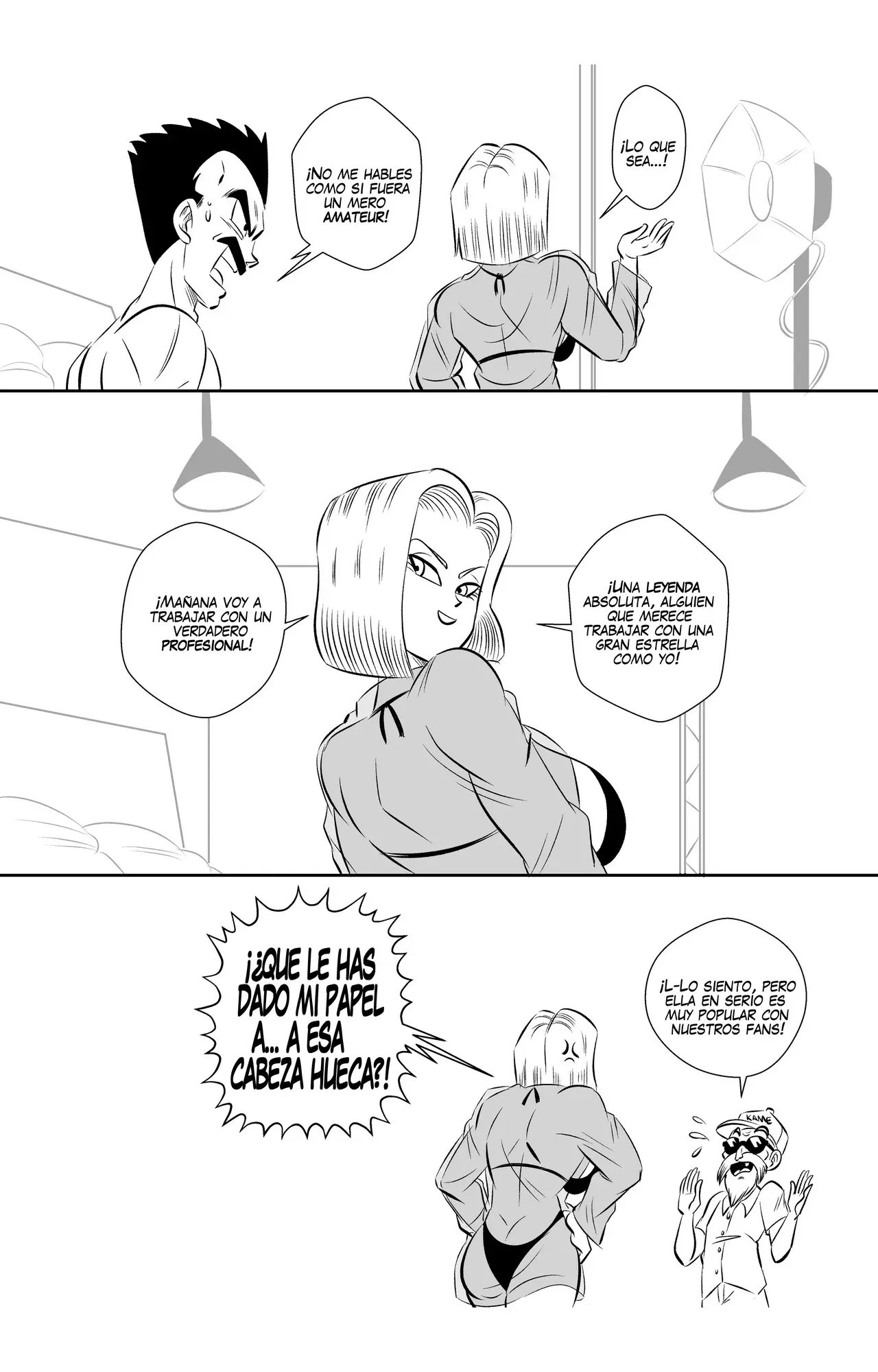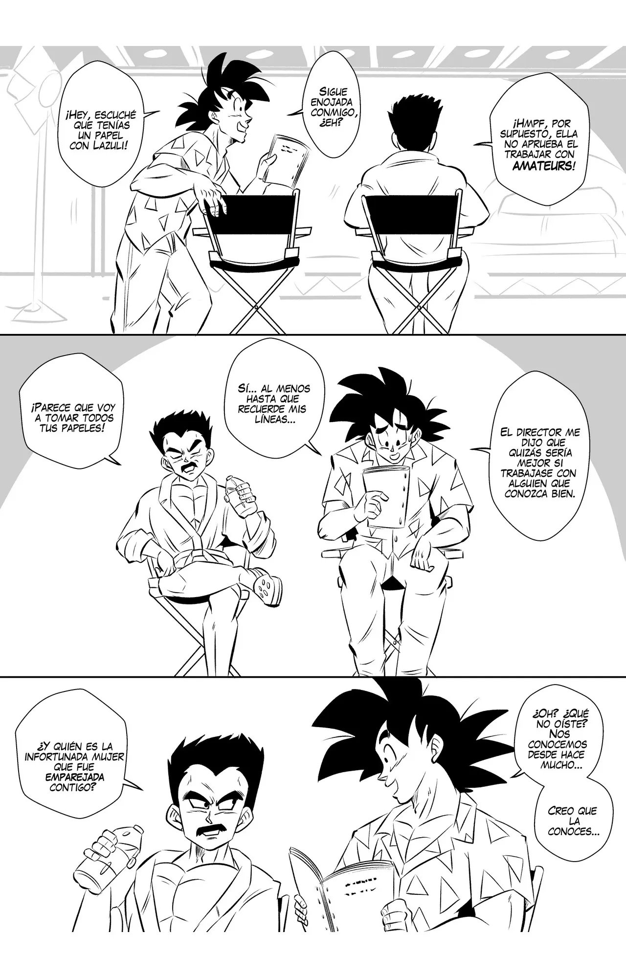 Goku y Vegeta hablaban sobre lo poco profesional que es Goku, hasta que llega Bulma y se alegra de que pueda volver a grabar otra escena con su mejor amigo. A quien le da un beso en la mejilla y le dice que espera que no haya perdido su toque. Eso enoja a Vegeta, que le dice que no se quedara esperando mientras ellos dos hacen una escena de sexo.